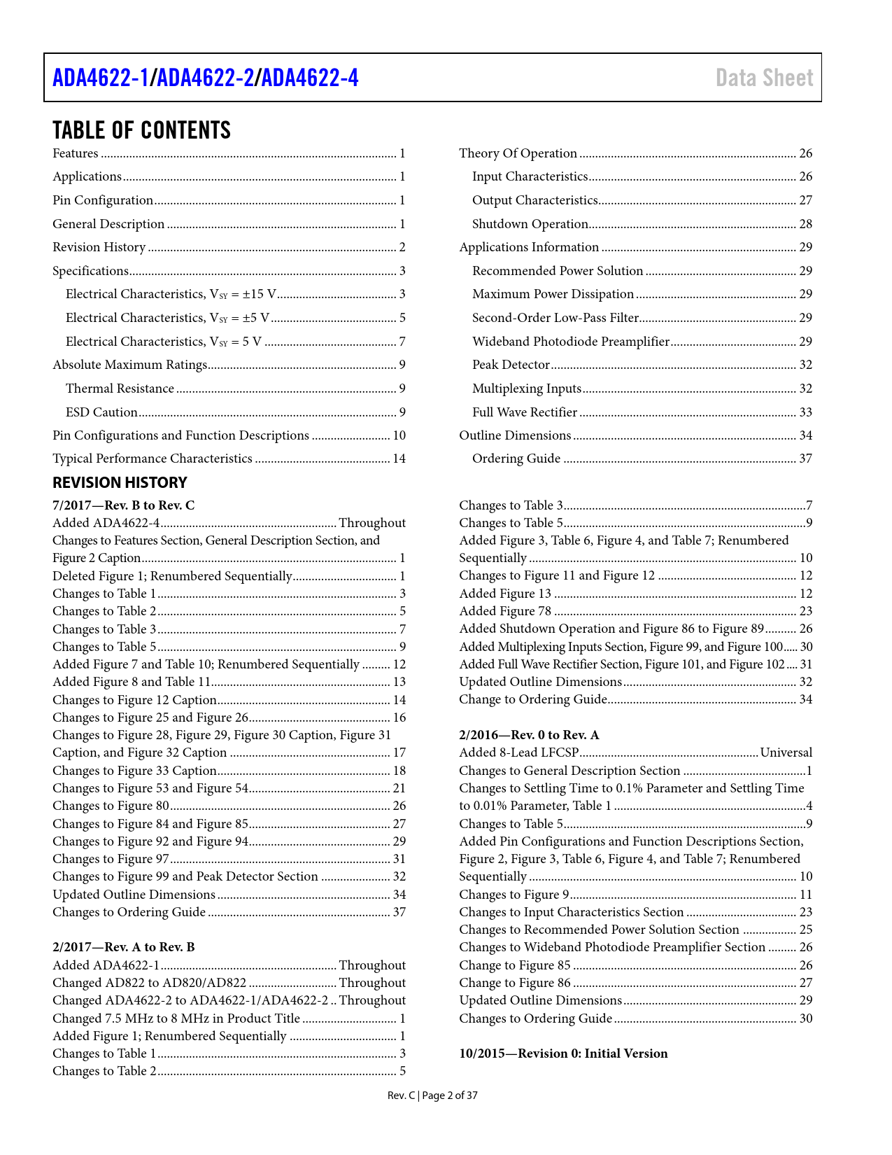 link to page 1 link to page 1 link to page 1 link to page 1 link to page 2 link to page 3 link to page 3 link to page 5 link to page 7 link to page 9 link to page 9 link to page 9 link to page 10 link to page 14 link to page 26 link to page 26 link to page 27 link to page 28 link to page 29 link to page 29 link to page 29 link to page 29 link to page 29 link to page 31 link to page 32 link to page 33 link to page 34 link to page 37 ADA4622-1/ADA4622-2/ADA4622-4Data SheetTABLE OF CONTENTS Features .. 1 Theory Of Operation ... 26 Applications ... 1 Input Characteristics .. 26 Pin Configuration ... 1 Output Characteristics... 27 General Description ... 1 Shutdown Operation.. 28 Revision History ... 2 Applications Information .. 29 Specifications ... 3 Recommended Power Solution .. 29 Electrical Characteristics, VSY = ±15 V .. 3 Maximum Power Dissipation ... 29 Electrical Characteristics, VSY = ±5 V .. 5 Second-Order Low-Pass Filter.. 29 Electrical Characteristics, VSY = 5 V .. 7 Wideband Photodiode Preamplifier .. 29 Absolute Maximum Ratings .. 9 Peak Detector .. 32 Thermal Resistance .. 9 Multiplexing Inputs .. 32 ESD Caution .. 9 Ful Wave Rectifier ... 33 Pin Configurations and Function Descriptions ... 10 Outline Dimensions ... 34 Typical Performance Characteristics ... 14 Ordering Guide .. 37 REVISION HISTORY 7/2017—Rev. B to Rev. C Changes to Table 3 ... 7 Added ADA4622-4 .. Throughout Changes to Table 5 ... 9 Changes to Features Section, General Description Section, and Added Figure 3, Table 6, Figure 4, and Table 7; Renumbered Figure 2 Caption ... 1 Sequentially ... 10 Deleted Figure 1; Renumbered Sequentially ... 1 Changes to Figure 11 and Figure 12 .. 12 Changes to Table 1 .. 3 Added Figure 13 ... 12 Changes to Table 2 .. 5 Added Figure 78 ... 23 Changes to Table 3 .. 7 Added Shutdown Operation and Figure 86 to Figure 89 .. 26 Changes to Table 5 .. 9 Added Multiplexing Inputs Section, Figure 99, and Figure 100 .. 30 Added Figure 7 and Table 10; Renumbered Sequentially ... 12 Added Ful Wave Rectifier Section, Figure 101, and Figure 102 .. 31 Added Figure 8 and Table 11... 13 Updated Outline Dimensions ... 32 Changes to Figure 12 Caption ... 14 Change to Ordering Guide .. 34 Changes to Figure 25 and Figure 26 ... 16 Changes to Figure 28, Figure 29, Figure 30 Caption, Figure 31 2/2016—Rev. 0 to Rev. A Caption, and Figure 32 Caption ... 17 Added 8-Lead LFCSP ... Universal Changes to Figure 33 Caption ... 18 Changes to General Description Section ... 1 Changes to Figure 53 and Figure 54 ... 21 Changes to Settling Time to 0.1% Parameter and Settling Time Changes to Figure 80 .. 26 to 0.01% Parameter, Table 1 ... 4 Changes to Figure 84 and Figure 85 ... 27 Changes to Table 5 ... 9 Changes to Figure 92 and Figure 94 ... 29 Added Pin Configurations and Function Descriptions Section, Changes to Figure 97 .. 31 Figure 2, Figure 3, Table 6, Figure 4, and Table 7; Renumbered Changes to Figure 99 and Peak Detector Section .. 32 Sequentially ... 10 Updated Outline Dimensions ... 34 Changes to Figure 9 .. 11 Changes to Ordering Guide .. 37 Changes to Input Characteristics Section ... 23 Changes to Recommended Power Solution Section ... 25 2/2017—Rev. A to Rev. B Changes to Wideband Photodiode Preamplifier Section ... 26 Added ADA4622-1 .. Throughout Change to Figure 85 ... 26 Changed AD822 to AD820/AD822 .. Throughout Change to Figure 86 ... 27 Changed ADA4622-2 to ADA4622-1/ADA4622-2 .. Throughout Updated Outline Dimensions ... 29 Changed 7.5 MHz to 8 MHz in Product Title .. 1 Changes to Ordering Guide .. 30 Added Figure 1; Renumbered Sequential y .. 1 Changes to Table 1 .. 3 10/2015—Revision 0: Initial Version Changes to Table 2 .. 5 Rev. C | Page 2 of 37 Document Outline FEATURES APPLICATIONS PIN CONFIGURATION GENERAL DESCRIPTION TABLE OF CONTENTS REVISION HISTORY SPECIFICATIONS ELECTRICAL CHARACTERISTICS, VSY = ±15 V ELECTRICAL CHARACTERISTICS, VSY = ±5 V ELECTRICAL CHARACTERISTICS, VSY = 5 V ABSOLUTE MAXIMUM RATINGS THERMAL RESISTANCE ESD CAUTION PIN CONFIGURATIONS AND FUNCTION DESCRIPTIONS TYPICAL PERFORMANCE CHARACTERISTICS THEORY OF OPERATION INPUT CHARACTERISTICS Input Overvoltage Protection EMI Rejection Ratio OUTPUT CHARACTERISTICS Capacitive Load Drive Capability SHUTDOWN OPERATION APPLICATIONS INFORMATION RECOMMENDED POWER SOLUTION MAXIMUM POWER DISSIPATION SECOND-ORDER LOW-PASS FILTER WIDEBAND PHOTODIODE PREAMPLIFIER PEAK DETECTOR MULTIPLEXING INPUTS FULL WAVE RECTIFIER OUTLINE DIMENSIONS ORDERING GUIDE