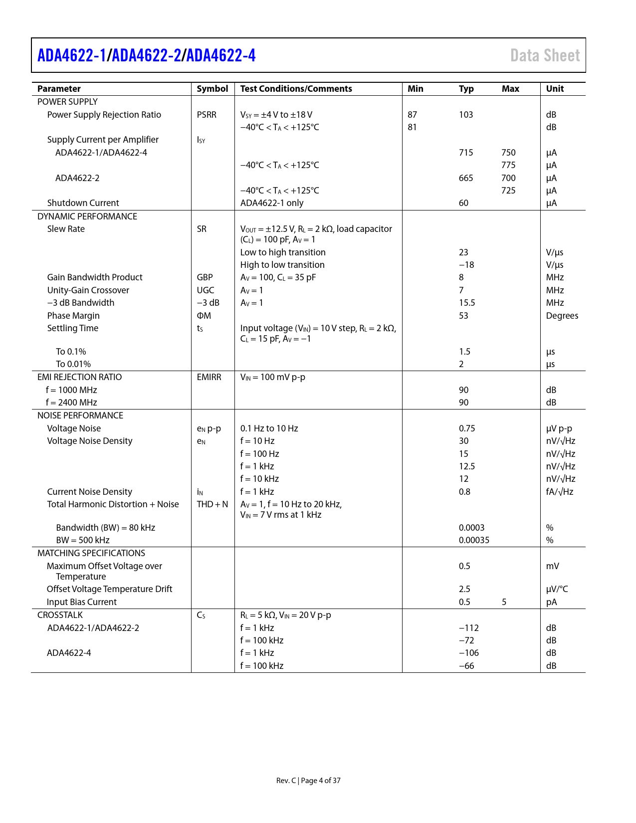 ADA4622-1/. ADA4622-2/. ADA4622-4. Data Sheet. Parameter. Symbol Test Conditions/Comments. Min. Typ. Max. Unit