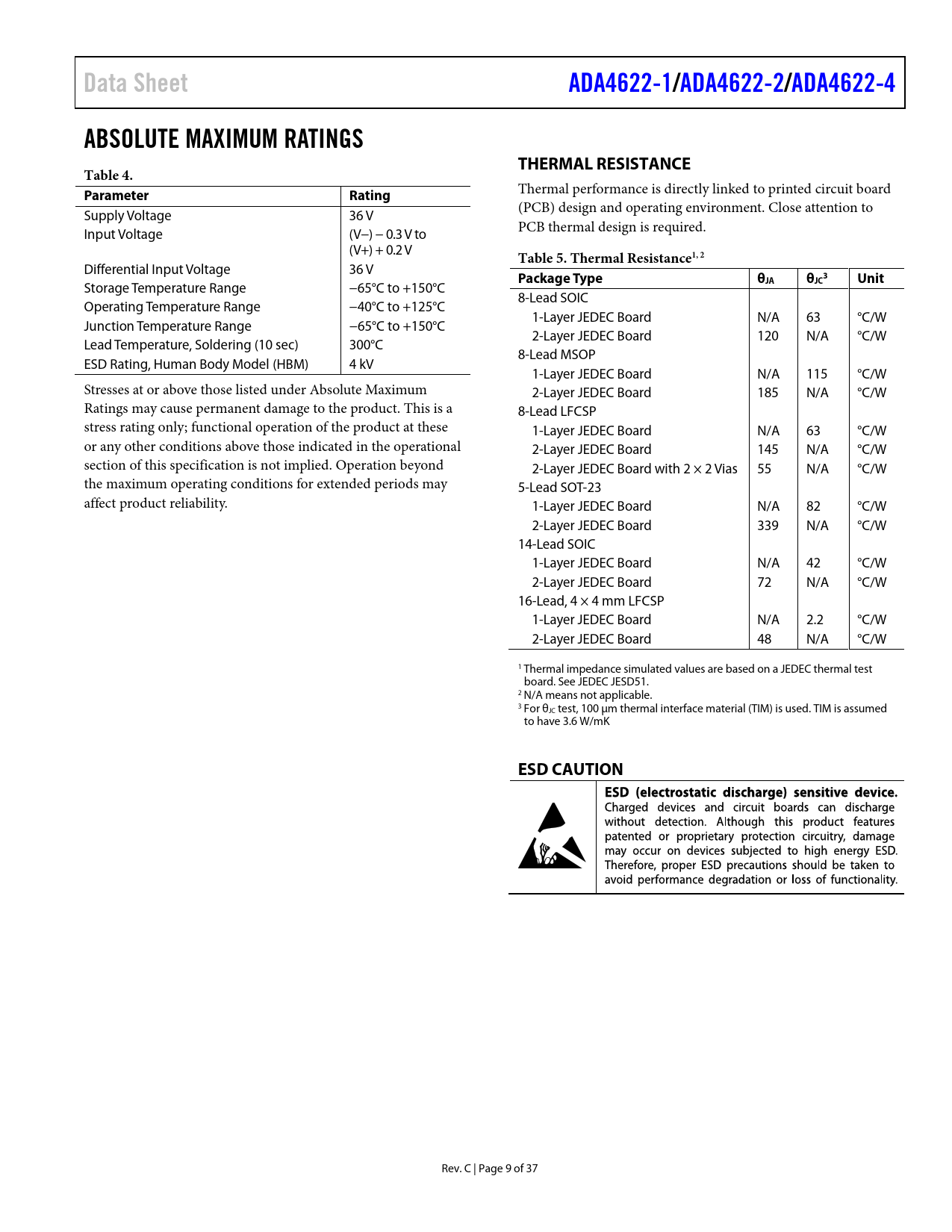 Data SheetADA4622-1/ADA4622-2/ADA4622-4ABSOLUTE MAXIMUM RATINGSTHERMAL RESISTANCETable 4. ParameterRating Thermal performance is directly linked to printed circuit board Supply Voltage 36 V (PCB) design and operating environment. Close attention to Input Voltage (V−) − 0.3 V to PCB thermal design is required. (V+) + 0.2 V Table 5. Thermal Resistance1, 2 Differential Input Voltage 36 V Package Typeθ3Unit Storage Temperature Range −65°C to +150°C JAθJC 8-Lead SOIC Operating Temperature Range −40°C to +125°C 1-Layer JEDEC Board N/A 63 °C/W Junction Temperature Range −65°C to +150°C 2-Layer JEDEC Board 120 N/A °C/W Lead Temperature, Soldering (10 sec) 300°C 8-Lead MSOP ESD Rating, Human Body Model (HBM) 4 kV 1-Layer JEDEC Board N/A 115 °C/W Stresses at or above those listed under Absolute Maximum 2-Layer JEDEC Board 185 N/A °C/W Ratings may cause permanent damage to the product. This is a 8-Lead LFCSP stress rating only; functional operation of the product at these 1-Layer JEDEC Board N/A 63 °C/W or any other conditions above those indicated in the operational 2-Layer JEDEC Board 145 N/A °C/W section of this specification is not implied. Operation beyond 2-Layer JEDEC Board with 2 × 2 Vias 55 N/A °C/W the maximum operating conditions for extended periods may 5-Lead SOT-23 affect product reliability. 1-Layer JEDEC Board N/A 82 °C/W 2-Layer JEDEC Board 339 N/A °C/W 14-Lead SOIC 1-Layer JEDEC Board N/A 42 °C/W 2-Layer JEDEC Board 72 N/A °C/W 16-Lead, 4 × 4 mm LFCSP 1-Layer JEDEC Board N/A 2.2 °C/W 2-Layer JEDEC Board 48 N/A °C/W 1 Thermal impedance simulated values are based on a JEDEC thermal test board. See JEDEC JESD51. 2 N/A means not applicable. 3 For θJC test, 100 μm thermal interface material (TIM) is used. TIM is assumed to have 3.6 W/mK ESD CAUTION Rev. C | Page 9 of 37 Document Outline FEATURES APPLICATIONS PIN CONFIGURATION GENERAL DESCRIPTION TABLE OF CONTENTS REVISION HISTORY SPECIFICATIONS ELECTRICAL CHARACTERISTICS, VSY = ±15 V ELECTRICAL CHARACTERISTICS, VSY = ±5 V ELECTRICAL CHARACTERISTICS, VSY = 5 V ABSOLUTE MAXIMUM RATINGS THERMAL RESISTANCE ESD CAUTION PIN CONFIGURATIONS AND FUNCTION DESCRIPTIONS TYPICAL PERFORMANCE CHARACTERISTICS THEORY OF OPERATION INPUT CHARACTERISTICS Input Overvoltage Protection EMI Rejection Ratio OUTPUT CHARACTERISTICS Capacitive Load Drive Capability SHUTDOWN OPERATION APPLICATIONS INFORMATION RECOMMENDED POWER SOLUTION MAXIMUM POWER DISSIPATION SECOND-ORDER LOW-PASS FILTER WIDEBAND PHOTODIODE PREAMPLIFIER PEAK DETECTOR MULTIPLEXING INPUTS FULL WAVE RECTIFIER OUTLINE DIMENSIONS ORDERING GUIDE