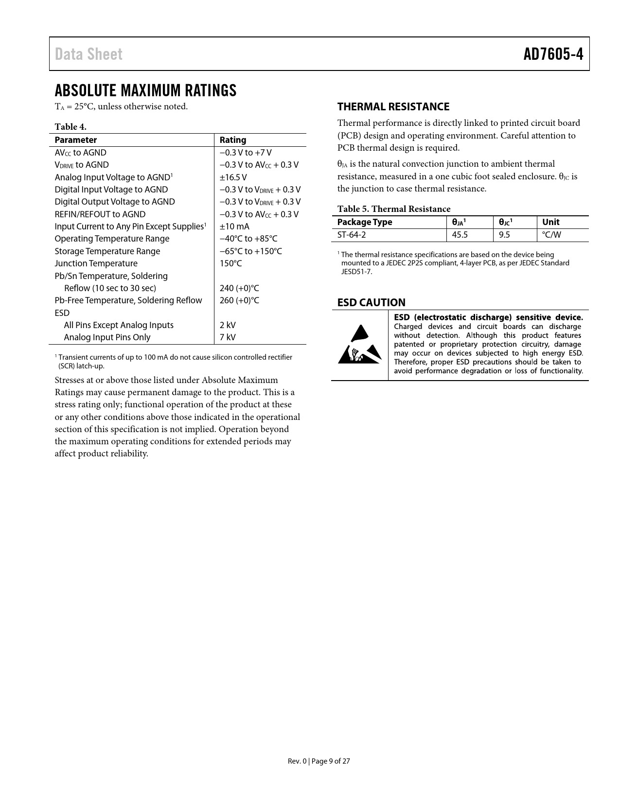 Data Sheet. AD7605-4. ABSOLUTE MAXIMUM RATINGS. THERMAL RESISTANCE. Table 4. Parameter. Rating. Table 5. Thermal Resistance