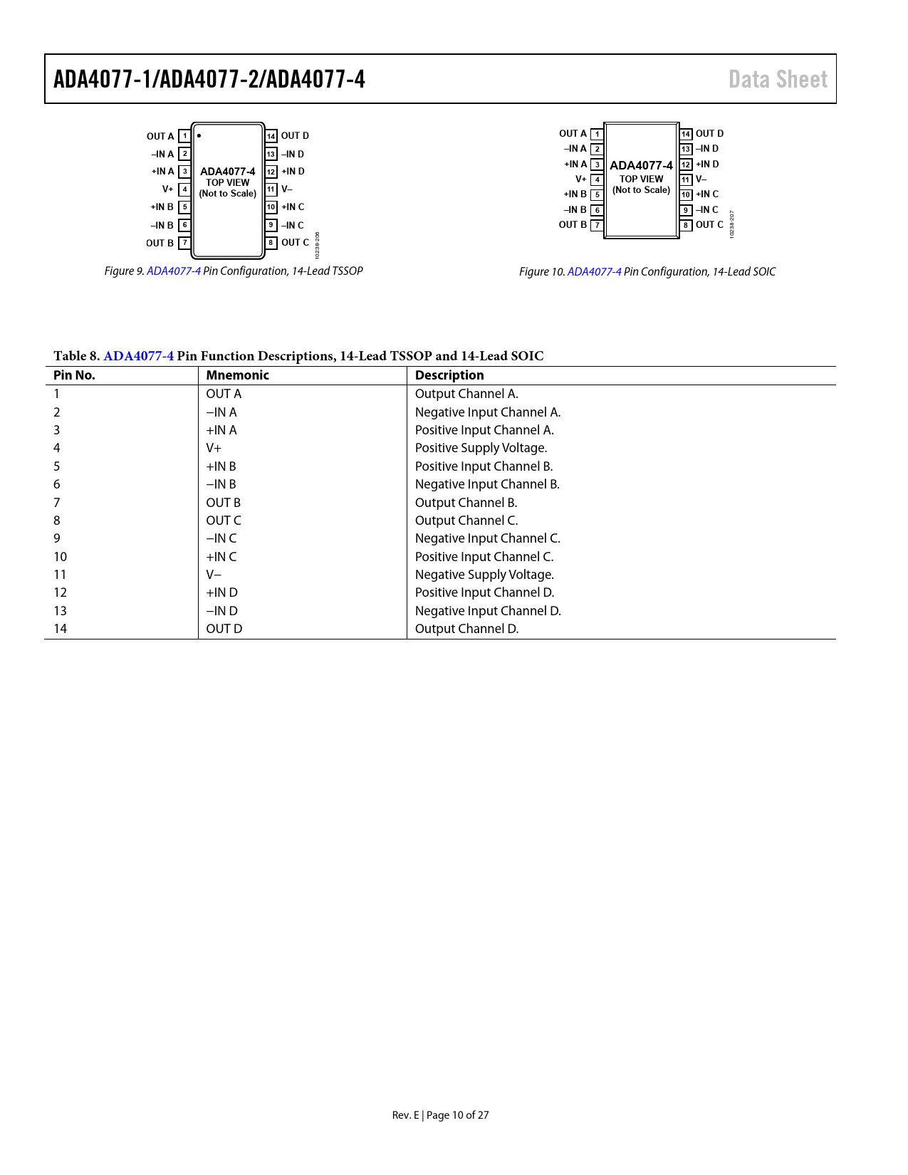 ADA4077-1/ADA4077-2/ADA4077-4Data SheetOUT A 114 OUT DOUT A 114 OUT D–IN A13 –IN D–IN A2213 –IN D+IN A 312 +IN DADA4077-4+IN A 3ADA4077-4 12 +IN DTOP VIEWV+ 4TOP VIEW11 V–V+ 411 V–(Not to Scale)+IN B(Not to Scale)510 +IN C+IN B 510 +IN C–IN B 69 –IN C 207 –IN B 69–IN COUT B 78 OUT C 38- 102 OUT B 78OUT C 206 238- 10 Figure 9. ADA4077-4 Pin Configuration, 14-Lead TSSOP Figure 10. ADA4077-4 Pin Configuration, 14-Lead SOIC Table 8. ADA4077-4 Pin Function Descriptions, 14-Lead TSSOP and 14-Lead SOIC Pin No.MnemonicDescription 1 OUT A Output Channel A. 2 −IN A Negative Input Channel A. 3 +IN A Positive Input Channel A. 4 V+ Positive Supply Voltage. 5 +IN B Positive Input Channel B. 6 −IN B Negative Input Channel B. 7 OUT B Output Channel B. 8 OUT C Output Channel C. 9 −IN C Negative Input Channel C. 10 +IN C Positive Input Channel C. 11 V− Negative Supply Voltage. 12 +IN D Positive Input Channel D. 13 −IN D Negative Input Channel D. 14 OUT D Output Channel D. Rev. E | Page 10 of 27 Document Outline FEATURES APPLICATIONS GENERAL DESCRIPTION PIN CONNECTION DIAGRAMS TABLE OF CONTENTS REVISION HISTORY SPECIFICATIONS ELECTRICAL CHARACTERISTICS, ±5 V ELECTRICAL CHARACTERISTICS, ±15 V ABSOLUTE MAXIMUM RATINGS THERMAL RESISTANCE ESD CAUTION PIN CONFIGURATIONS AND FUNCTION DESCRIPTIONS TYPICAL PERFORMANCE CHARACTERISTICS TEST CIRCUIT THEORY OF OPERATION APPLICATIONS INFORMATION OUTPUT PHASE REVERSAL LOW POWER LINEARIZED RTD PROPER BOARD LAYOUT LONG-TERM DRIFT TEMPERATURE HYSTERESIS OUTLINE DIMENSIONS ORDERING GUIDE