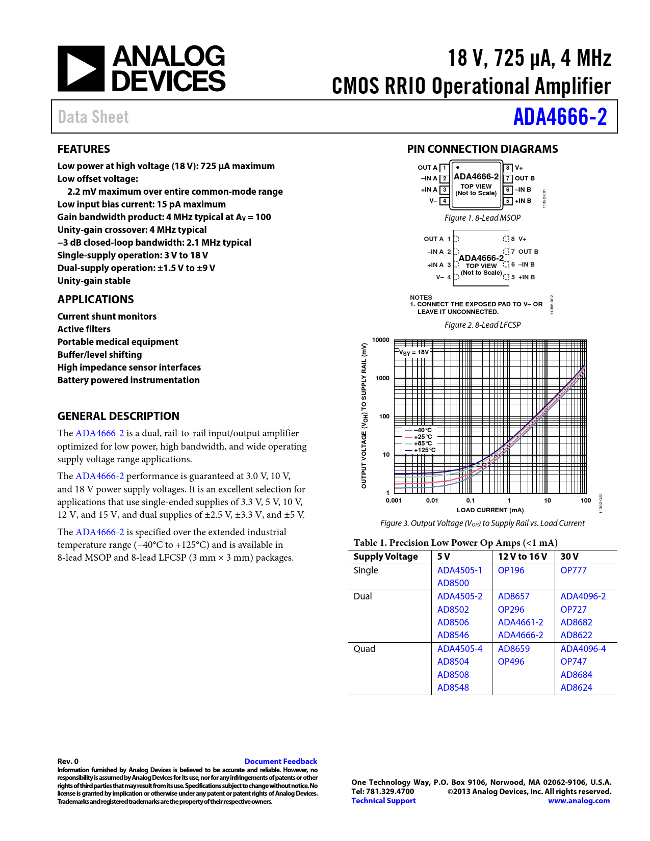 18 V, 725 µA, 4 MHz. CMOS RRIO Operational Amplifier. Data Sheet. ADA4666-2. FEATURES. PIN CONNECTION DIAGRAMS