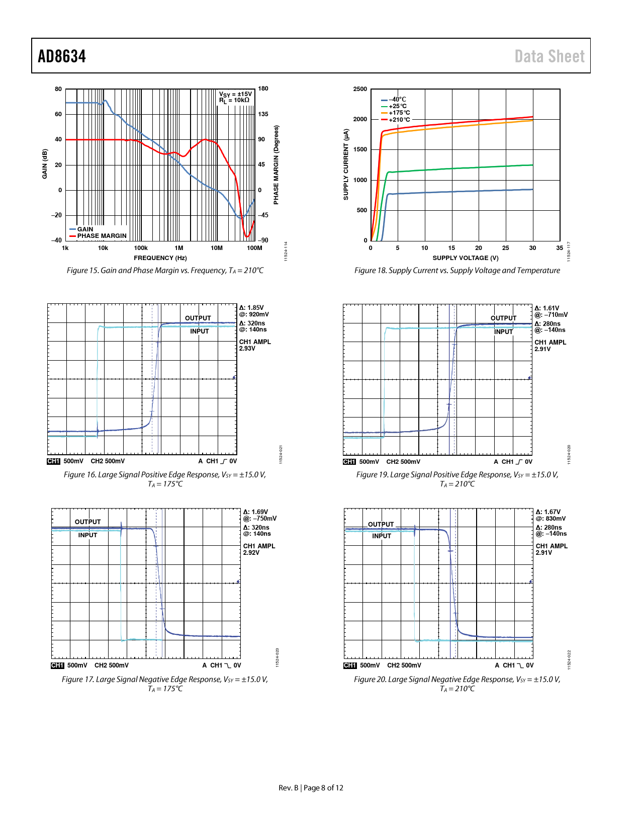 180. 2500. VSY = ±15V. –40°C. L = 10kΩ. +25°C. 135. +175°C. 2000. +210°C. ) s. re g. 1500. L 1000. 500. –20. –45. GAIN PHASE MARGIN. –40. –90. 10k. 100k. 10M. 100M