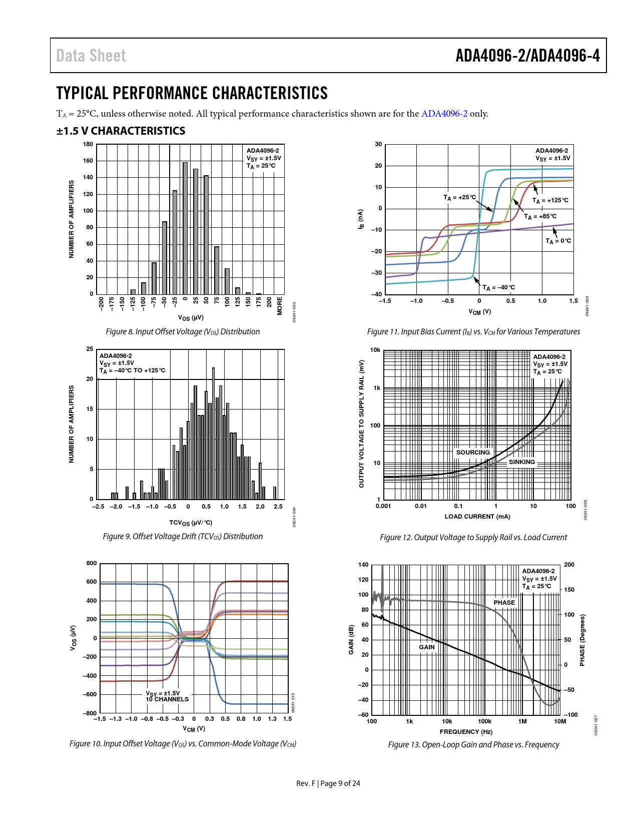 Data SheetADA4096-2/ADA4096-4TYPICAL PERFORMANCE CHARACTERISTICS TA = 25°C, unless otherwise noted. Al typical performance characteristics shown are for the ADA4096-2 only. ±1.5 V CHARACTERISTICS18030ADA4096-2ADA4096-2160VSY = ±1.5VVSY = ±1.5VTA = 25°C20140RS10IE120IFTA = +25°CLTA = +125°CP1000A)AMnTA = +85°CF(80I B–10R O BET60A = 0°C–20NUM40–3020TA = –40°C0–400255075–1.5–1.0–0.500.51.01.5 005 –75–50–25100125150175200RE–200–175–150–125–100O 003 MVCM (V)V 09241- OS (µV) 09241- Figure 8. Input Offset Voltage (VOS) Distribution Figure 11. Input Bias Current (IB) vs. VCM for Various Temperatures 2510kADA4096-2ADA4096-2)VSY = ±1.5VVVSY = ±1.5VTmA = –40°C TO +125°CTA = 25°C20IL ( A1kRSRIELYIFPL15PPUAM F100TO SR O10GEBESOURCINGOLTANUMT V10SINKING5U TPOU01–2.5–2.0–1.5–1.0–0.500.51.01.52.02.50.0010.010.1110100 006 004 LOAD CURRENT (mA) 09241- TCVOS (µV/°C) 09241- Figure 9. Offset Voltage Drift (TCVOS) Distribution Figure 12. Output Voltage to Supply Rail vs. Load Current 800140200ADA4096-2 V600120SY = ±1.5VTA = 25°C150100400PHASE8010020060V)B)rees)µd(04050DegN (OS(VAIGAINEG–20020HAS0P0–400–20–50–600VSY = ±1.5V 210 10 CHANNELS–40–800 09241- –60–100–1.5 –1.3 –1.0 –0.8 –0.5 –0.300.30.50.81.01.31.51001k10k100k1M10M 007 VCM (V)FREQUENCY (Hz) 09241- Figure 10. Input Offset Voltage (VOS) vs. Common-Mode Voltage (VCM) Figure 13. Open-Loop Gain and Phase vs. Frequency Rev. F | Page 9 of 24 Document Outline FEATURES APPLICATIONS PIN CONNECTION DIAGRAMS GENERAL DESCRIPTION TABLE OF CONTENTS REVISION HISTORY SPECIFICATIONS ELECTRICAL SPECIFICATIONS, VSY = ±1.5 V ELECTRICAL SPECIFICATIONS, VSY = ±5 V ELECTRICAL SPECIFICATIONS, VSY = ±15 V ABSOLUTE MAXIMUM RATINGS THERMAL RESISTANCE ESD CAUTION PIN CONFIGURATIONS AND FUNCTION DESCRIPTIONS TYPICAL PERFORMANCE CHARACTERISTICS ±1.5 V CHARACTERISTICS ±5 V CHARACTERISTICS ±15 V CHARACTERISTICS COMPARATIVE VOLTAGE AND VARIABLE VOLTAGE GRAPHS THEORY OF OPERATION INPUT STAGE PHASE INVERSION INPUT OVERVOLTAGE PROTECTION COMPARATOR OPERATION OUTLINE DIMENSIONS ORDERING GUIDE AUTOMOTIVE PRODUCTS