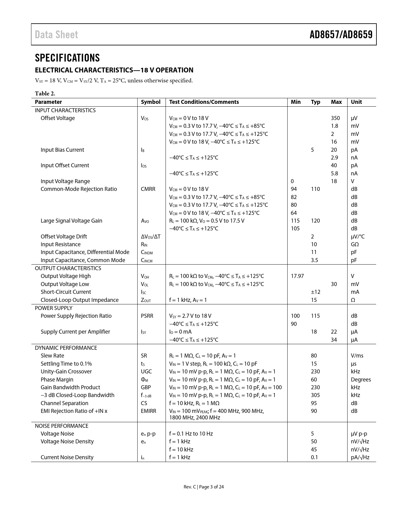 Seiten / Seite24 / 3 — Data Sheet. AD8657/AD8659. SPECIFICATIONS ELECTRICAL CHARACTERISTICS—18 V …