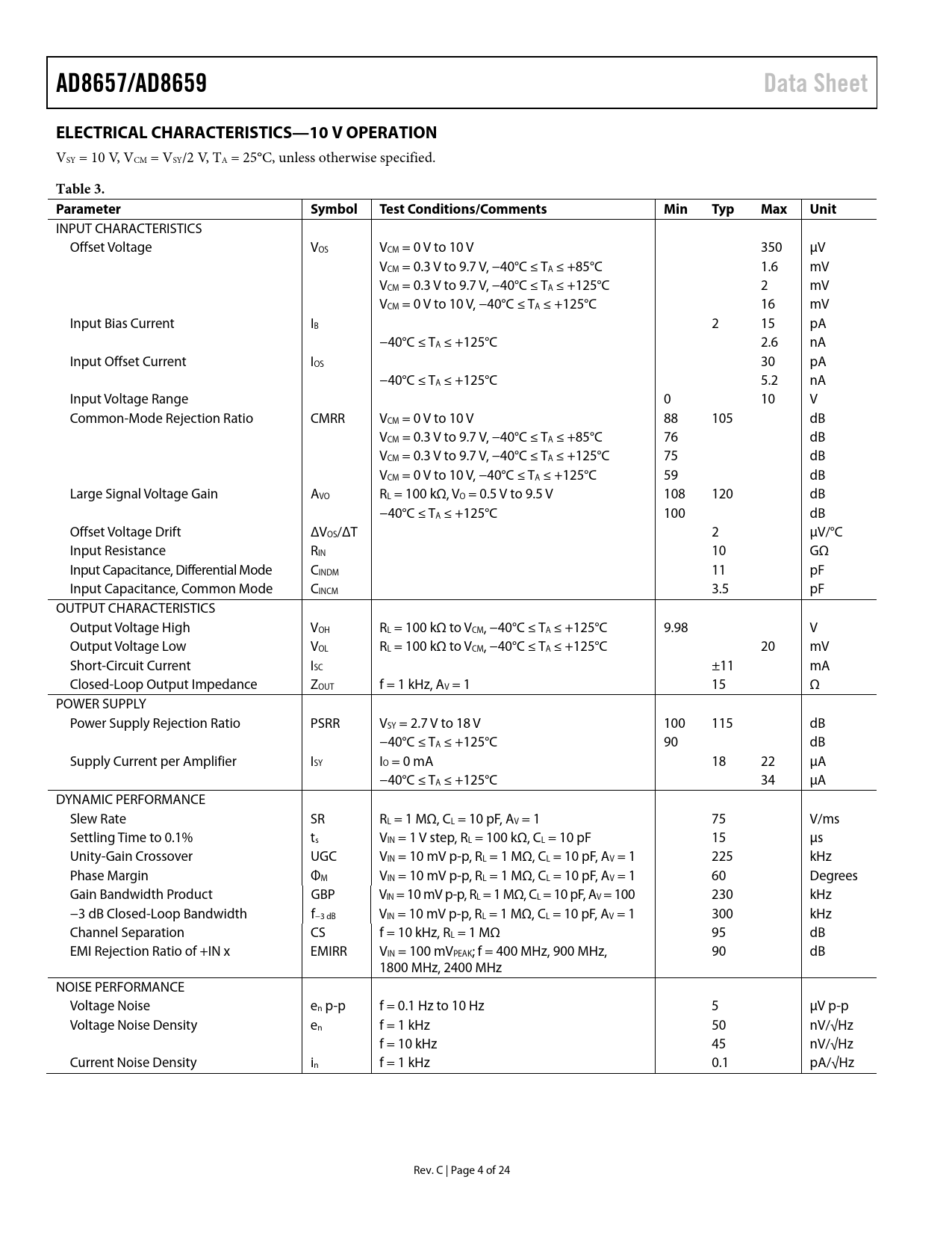 AD8657/AD8659. Data Sheet. ELECTRICAL CHARACTERISTICS—10 V OPERATION. Table 3. Parameter. Symbol. Test Conditions/Comments. Min. Typ