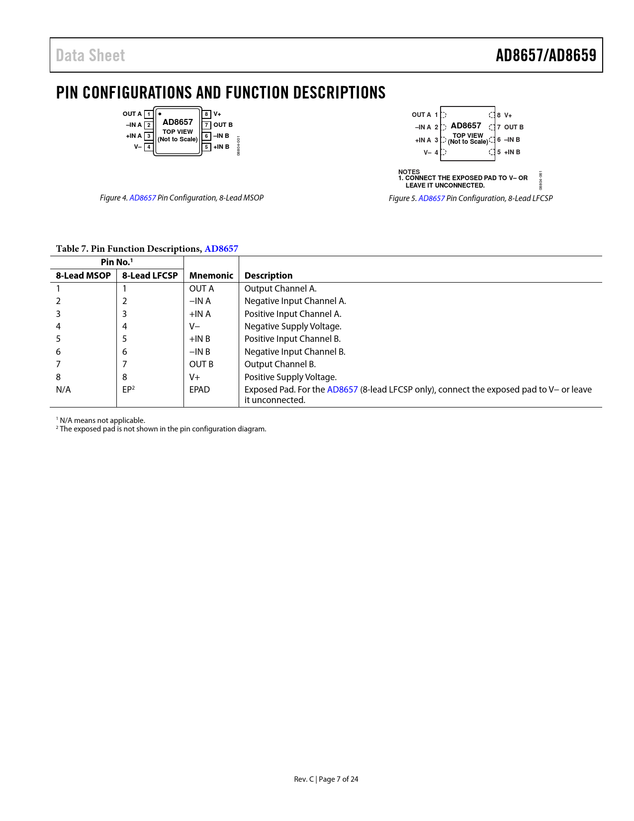 Data Sheet AD8657/AD8659 PIN CONFIGURATIONS AND FUNCTION DESCRIPTIONS OUT A 1 8 V+ –IN A AD8657 OUT B –IN A 2 7 OUT B TOP VIEW