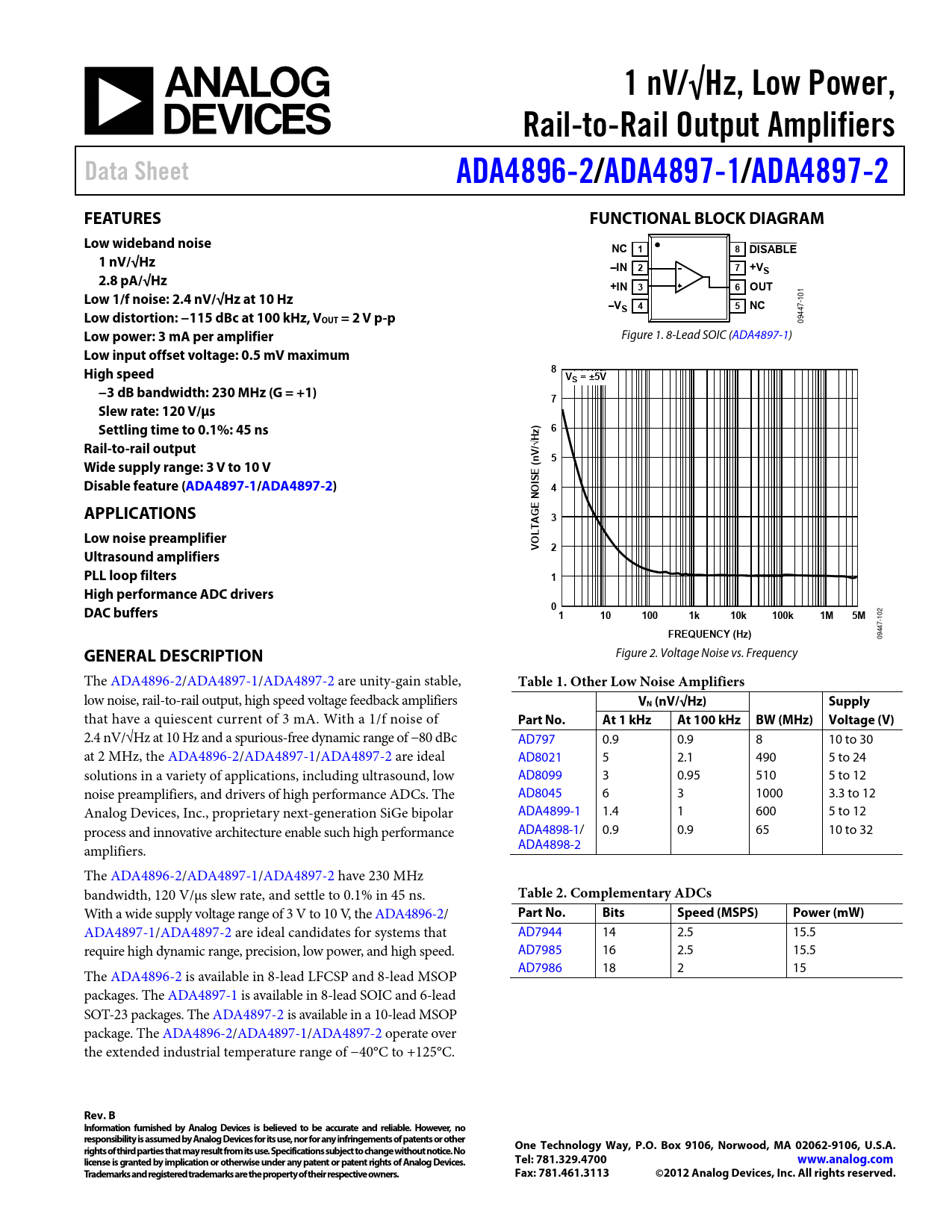1 nV/√Hz, Low Power,. Rail-to-Rail Output Amplifiers. Data Sheet. ADA4896-2. /ADA4897-1/. ADA4897-2. FEATURES