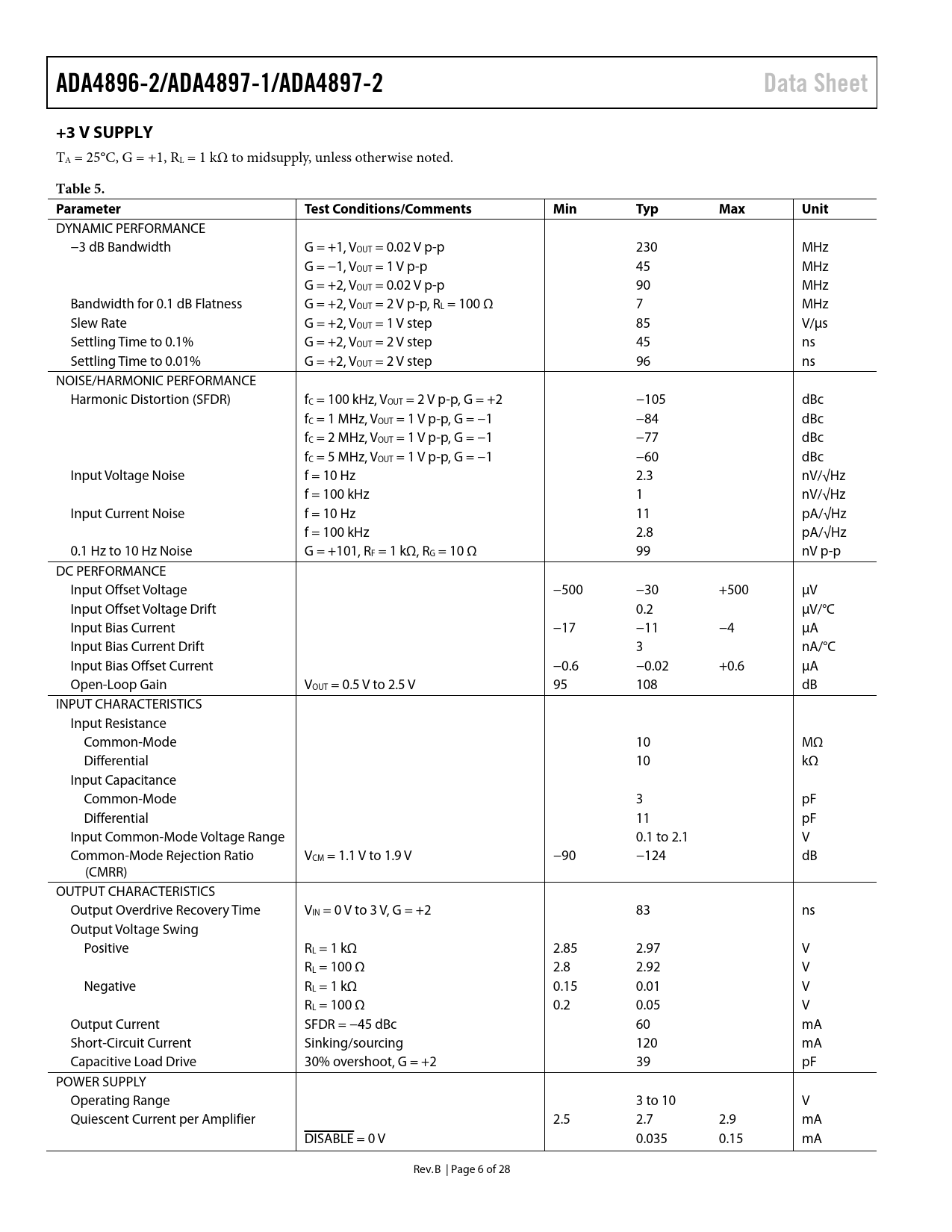 ADA4896-2/ADA4897-1/ADA4897-2Data Sheet+3 V SUPPLY TA = 25°C, G = +1, RL = 1 kΩ to midsupply, unless otherwise noted. Table 5. Parameter TestConditions/CommentsMinTypMaxUnit DYNAMIC PERFORMANCE −3 dB Bandwidth G = +1, VOUT = 0.02 V p-p 230 MHz G = −1, VOUT = 1 V p-p 45 MHz G = +2, VOUT = 0.02 V p-p 90 MHz Bandwidth for 0.1 dB Flatness G = +2, VOUT = 2 V p-p, RL = 100 Ω 7 MHz Slew Rate G = +2, VOUT = 1 V step 85 V/μs Settling Time to 0.1% G = +2, VOUT = 2 V step 45 ns Settling Time to 0.01% G = +2, VOUT = 2 V step 96 ns NOISE/HARMONIC PERFORMANCE Harmonic Distortion (SFDR) fC = 100 kHz, VOUT = 2 V p-p, G = +2 −105 dBc fC = 1 MHz, VOUT = 1 V p-p, G = −1 −84 dBc fC = 2 MHz, VOUT = 1 V p-p, G = −1 −77 dBc fC = 5 MHz, VOUT = 1 V p-p, G = −1 −60 dBc Input Voltage Noise f = 10 Hz 2.3 nV/√Hz f = 100 kHz 1 nV/√Hz Input Current Noise f = 10 Hz 11 pA/√Hz f = 100 kHz 2.8 pA/√Hz 0.1 Hz to 10 Hz Noise G = +101, RF = 1 kΩ, RG = 10 Ω 99 nV p-p DC PERFORMANCE Input Offset Voltage −500 −30 +500 μV Input Offset Voltage Drift 0.2 μV/°C Input Bias Current −17 −11 −4 μA Input Bias Current Drift 3 nA/°C Input Bias Offset Current −0.6 −0.02 +0.6 μA Open-Loop Gain VOUT = 0.5 V to 2.5 V 95 108 dB INPUT CHARACTERISTICS Input Resistance Common-Mode 10 MΩ Differential 10 kΩ Input Capacitance Common-Mode 3 pF Differential 11 pF Input Common-Mode Voltage Range 0.1 to 2.1 V Common-Mode Rejection Ratio VCM = 1.1 V to 1.9 V −90 −124 dB (CMRR) OUTPUT CHARACTERISTICS Output Overdrive Recovery Time VIN = 0 V to 3 V, G = +2 83 ns Output Voltage Swing Positive RL = 1 kΩ 2.85 2.97 V RL = 100 Ω 2.8 2.92 V Negative RL = 1 kΩ 0.15 0.01 V RL = 100 Ω 0.2 0.05 V Output Current SFDR = −45 dBc 60 mA Short-Circuit Current Sinking/sourcing 120 mA Capacitive Load Drive 30% overshoot, G = +2 39 pF POWER SUPPLY Operating Range 3 to 10 V Quiescent Current per Amplifier 2.5 2.7 2.9 mA DISABLE = 0 V 0.035 0.15 mA Rev. B | Page 6 of 28 Document Outline FEATURES APPLICATIONS GENERAL DESCRIPTION FUNCTIONAL BLOCK DIAGRAM TABLE OF CONTENTS REVISION HISTORY SPECIFICATIONS ±5 V SUPPLY +5 V SUPPLY +3 V SUPPLY ABSOLUTE MAXIMUM RATINGS THERMAL RESISTANCE MAXIMUM POWER DISSIPATION ESD CAUTION PIN CONFIGURATIONS AND FUNCTION DESCRIPTIONS TYPICAL PERFORMANCE CHARACTERISTICS THEORY OF OPERATION AMPLIFIER DESCRIPTION INPUT PROTECTION DISABLE OPERATION DC ERRORS BIAS CURRENT CANCELLATION NOISE CONSIDERATIONS CAPACITANCE DRIVE APPLICATIONS INFORMATION TYPICAL PERFORMANCE VALUES LOW NOISE, GAIN SELECTABLE AMPLIFIER MEDICAL ULTRASOUND APPLICATIONS Overview of the Ultrasound System ADA4896-2/ADA4897-1/ADA4897-2 in the Ultrasound System LAYOUT CONSIDERATIONS Ground Plane Power Supply Bypassing OUTLINE DIMENSIONS ORDERING GUIDE