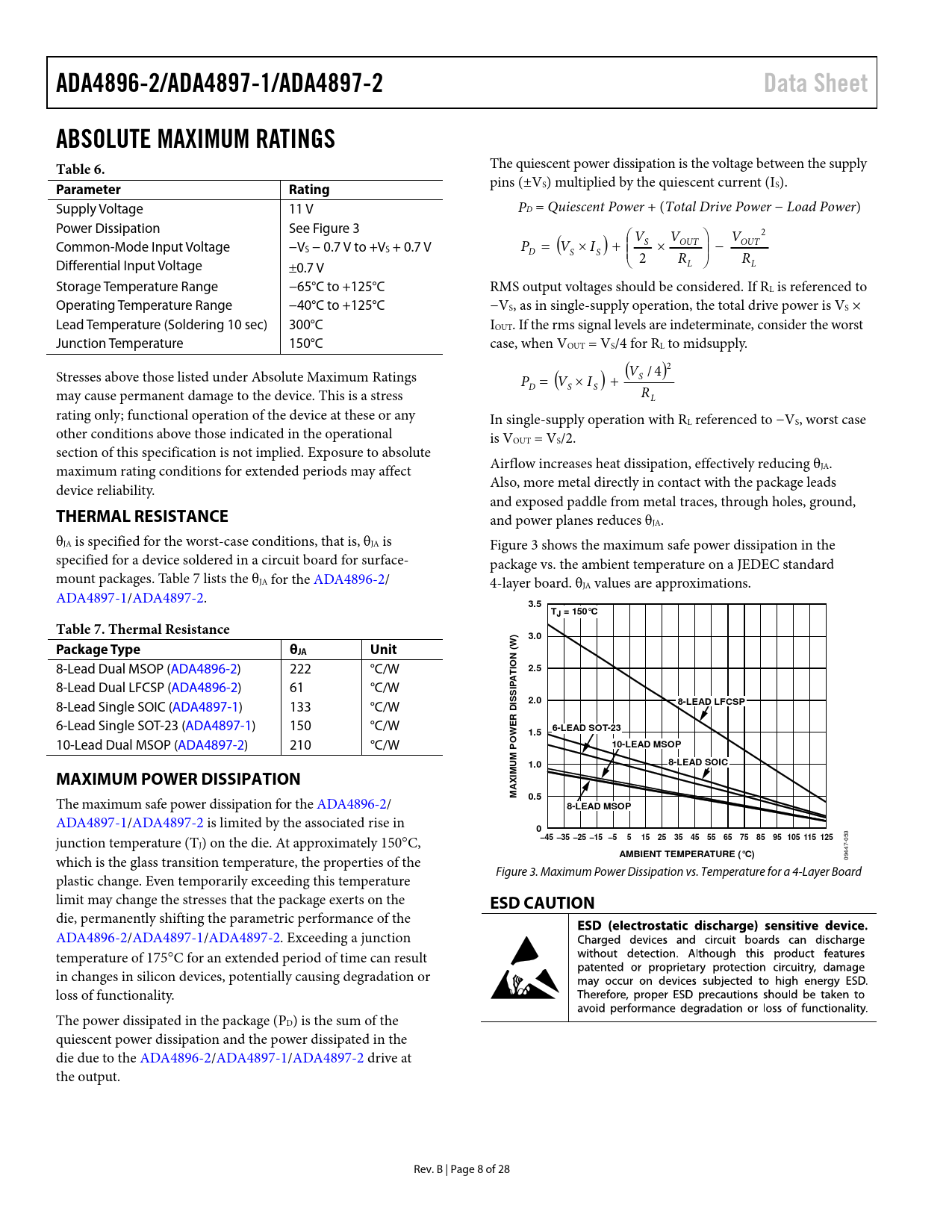 ADA4896-2/ADA4897-1/ADA4897-2. Data Sheet. ABSOLUTE MAXIMUM RATINGS Table 6. Parameter Rating. THERMAL RESISTANCE. 3.5. TJ = 150°C