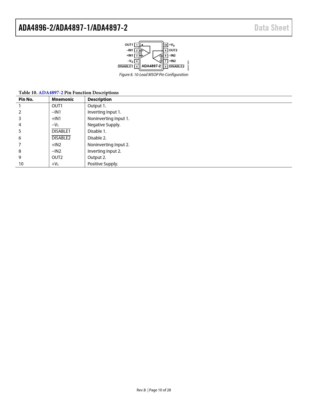 ADA4896-2/ADA4897-1/ADA4897-2. Data Sheet. OUT1 1. 10 +VS. –IN1 2. 9 OUT2. +IN1 3. 8 –IN2. –VS 4. 7 +IN2. DISABLE1 5. ADA4897-2 6 DISABLE2