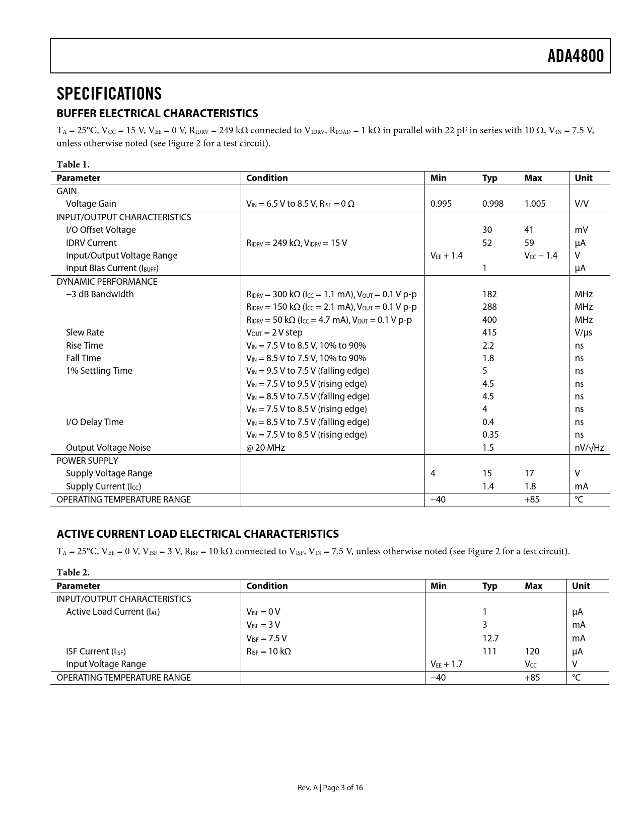 link to page 1 link to page 1 ADA4800SPECIFICATIONS BUFFER ELECTRICAL CHARACTERISTICS TA = 25°C, VCC = 15 V, VEE = 0 V, RIDRV = 249 kΩ connected to VIDRV, RLOAD = 1 kΩ in parallel with 22 pF in series with 10 Ω, VIN = 7.5 V, unless otherwise noted (see Figure 2 for a test circuit). Table 1. Parameter Condition MinTypMaxUnit GAIN Voltage Gain VIN = 6.5 V to 8.5 V, RISF = 0 Ω 0.995 0.998 1.005 V/V INPUT/OUTPUT CHARACTERISTICS I/O Offset Voltage 30 41 mV IDRV Current RIDRV = 249 kΩ, VIDRV = 15 V 52 59 μA Input/Output Voltage Range VEE + 1.4 VCC − 1.4 V Input Bias Current (IBUFF) 1 μA DYNAMIC PERFORMANCE −3 dB Bandwidth RIDRV = 300 kΩ (ICC = 1.1 mA), VOUT = 0.1 V p-p 182 MHz RIDRV = 150 kΩ (ICC = 2.1 mA), VOUT = 0.1 V p-p 288 MHz RIDRV = 50 kΩ (ICC = 4.7 mA), VOUT = 0.1 V p-p 400 MHz Slew Rate VOUT = 2 V step 415 V/μs Rise Time VIN = 7.5 V to 8.5 V, 10% to 90% 2.2 ns Fall Time VIN = 8.5 V to 7.5 V, 10% to 90% 1.8 ns 1% Settling Time VIN = 9.5 V to 7.5 V (falling edge) 5 ns VIN = 7.5 V to 9.5 V (rising edge) 4.5 ns VIN = 8.5 V to 7.5 V (falling edge) 4.5 ns VIN = 7.5 V to 8.5 V (rising edge) 4 ns I/O Delay Time VIN = 8.5 V to 7.5 V (falling edge) 0.4 ns VIN = 7.5 V to 8.5 V (rising edge) 0.35 ns Output Voltage Noise @ 20 MHz 1.5 nV/√Hz POWER SUPPLY Supply Voltage Range 4 15 17 V Supply Current (ICC) 1.4 1.8 mA OPERATING TEMPERATURE RANGE −40 +85 °C ACTIVE CURRENT LOAD ELECTRICAL CHARACTERISTICS TA = 25°C, VEE = 0 V, VISF = 3 V, RISF = 10 kΩ connected to VISF, VIN = 7.5 V, unless otherwise noted (see Figure 2 for a test circuit). Table 2. Parameter Condition MinTypMaxUnit INPUT/OUTPUT CHARACTERISTICS Active Load Current (IAL) VISF = 0 V 1 μA VISF = 3 V 3 mA VISF = 7.5 V 12.7 mA ISF Current (IISF) RISF = 10 kΩ 111 120 μA Input Voltage Range VEE + 1.7 VCC V OPERATING TEMPERATURE RANGE −40 +85 °C Rev. A | Page 3 of 16 Document Outline FEATURES APPLICATIONS FUNCTIONAL BLOCK DIAGRAM GENERAL DESCRIPTION TABLE OF CONTENTS REVISION HISTORY SPECIFICATIONS BUFFER ELECTRICAL CHARACTERISTICS ACTIVE CURRENT LOAD ELECTRICAL CHARACTERISTICS ABSOLUTE MAXIMUM RATINGS THERMAL RESISTANCE ESD CAUTION PIN CONFIGURATION AND FUNCTION DESCRIPTIONS TYPICAL PERFORMANCE CHARACTERISTICS TEST CIRCUIT THEORY OF OPERATION SETTING ACTIVE LOAD CURRENT WITH PIN 6 (ISF) SETTING BANDWIDTH WITH PIN 4 (IDRV) APPLICATIONS INFORMATION OPEN SOURCE CCD OUTPUT BUFFER POWER SAVE MODE POWER SUPPLY BYPASSING POWER SEQUENCING OUTLINE DIMENSIONS ORDERING GUIDE