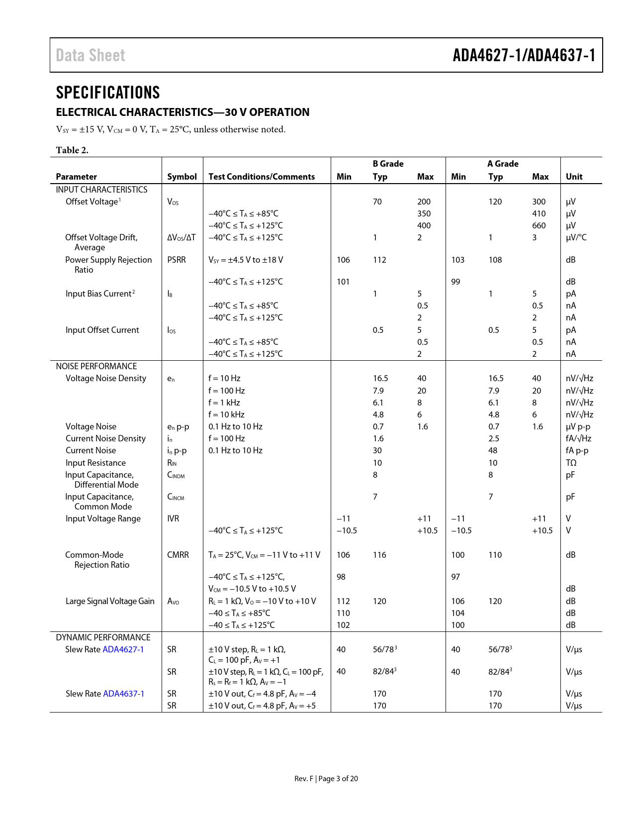 Data Sheet. ADA4627-1/ADA4637-1. SPECIFICATIONS ELECTRICAL CHARACTERISTICS—30 V OPERATION. Table 2. B Grade. A Grade. Parameter