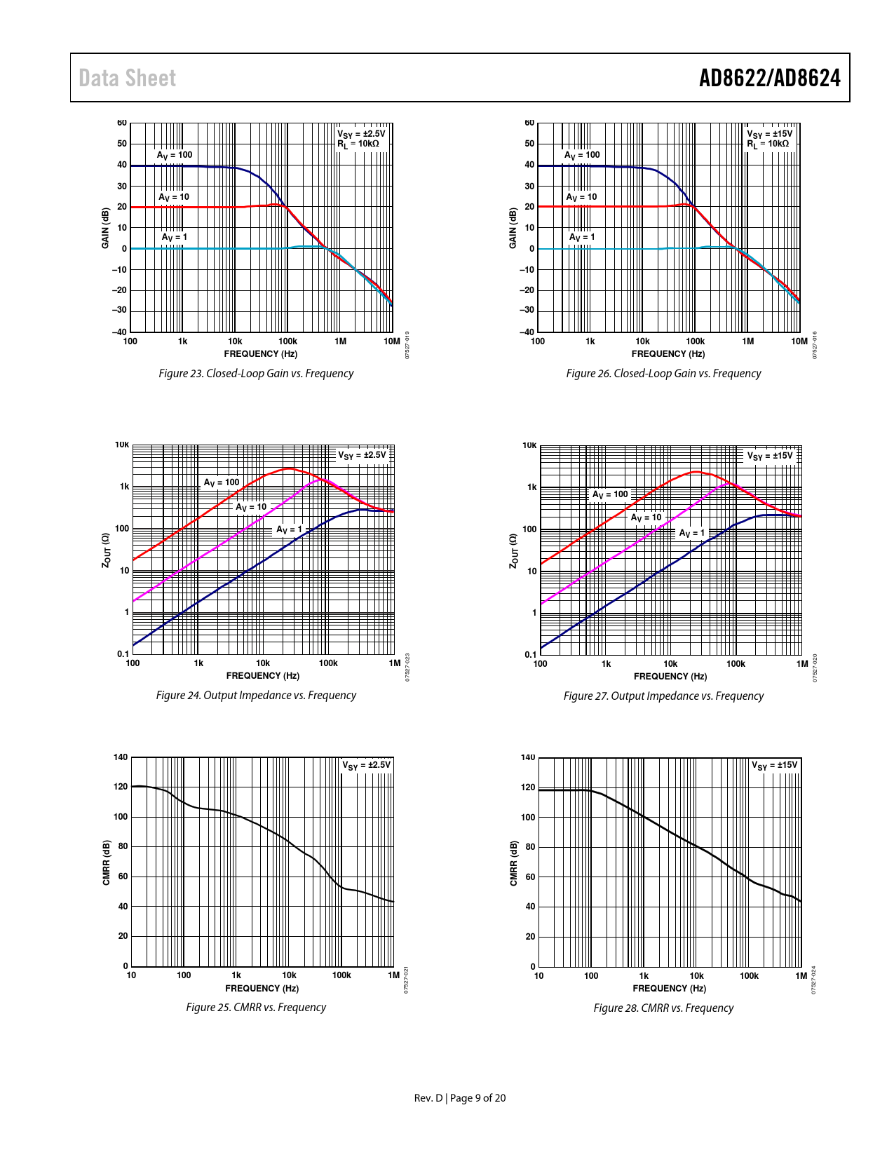 Data Sheet. AD8622/AD8624. VSY = ±2.5V. VSY = ±15V. RL = 10kΩ. AV = 100. AV = 10. N (. AV = 1. –10. –20. –30. –40. 100. 10k. 100k. 10M. FREQUENCY (Hz)