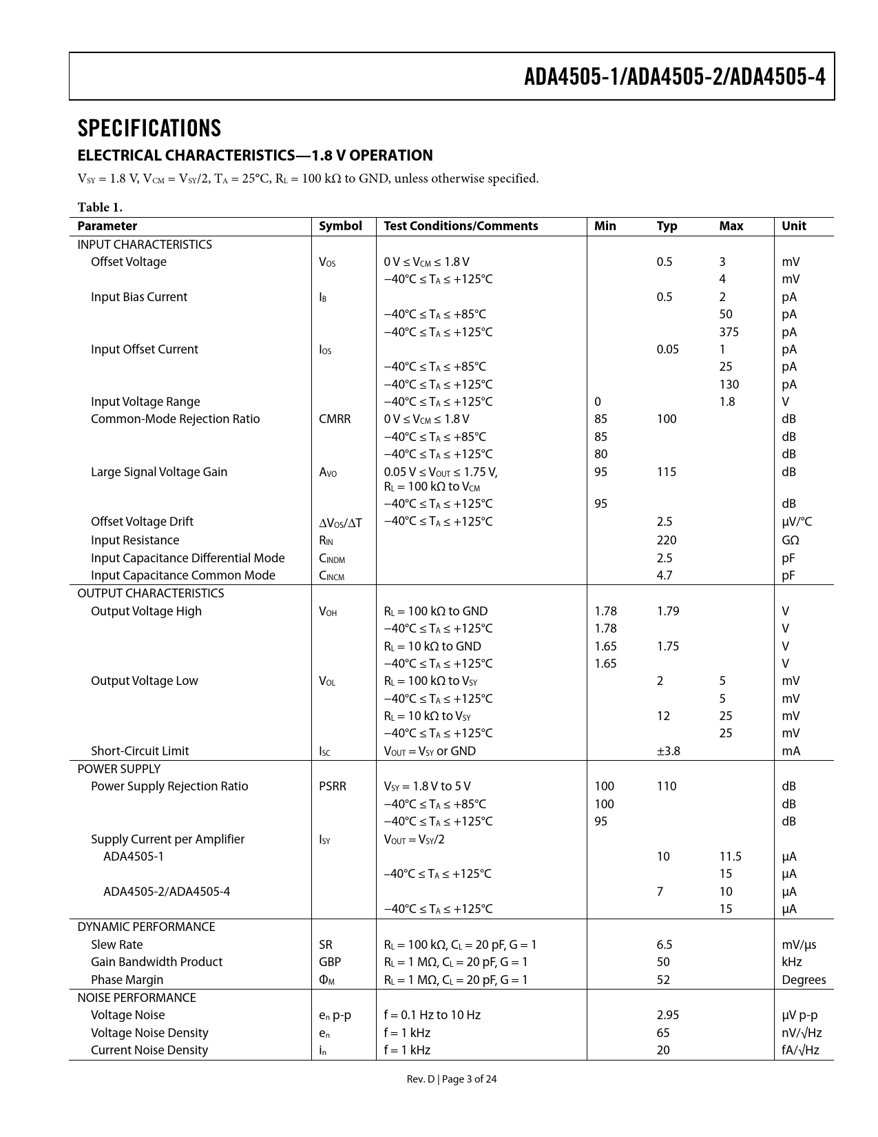 ADA4505-1/ADA4505-2/ADA4505-4SPECIFICATIONS ELECTRICAL CHARACTERISTICS—1.8 V OPERATION VSY = 1.8 V, VCM = VSY/2, TA = 25°C, RL = 100 kΩ to GND, unless otherwise specified. Table 1. Parameter SymbolTestConditions/CommentsMinTypMaxUnit INPUT CHARACTERISTICS Offset Voltage VOS 0 V ≤ VCM ≤ 1.8 V 0.5 3 mV −40°C ≤ TA ≤ +125°C 4 mV Input Bias Current IB 0.5 2 pA −40°C ≤ TA ≤ +85°C 50 pA −40°C ≤ TA ≤ +125°C 375 pA Input Offset Current IOS 0.05 1 pA −40°C ≤ TA ≤ +85°C 25 pA −40°C ≤ TA ≤ +125°C 130 pA Input Voltage Range −40°C ≤ TA ≤ +125°C 0 1.8 V Common-Mode Rejection Ratio CMRR 0 V ≤ VCM ≤ 1.8 V 85 100 dB −40°C ≤ TA ≤ +85°C 85 dB −40°C ≤ TA ≤ +125°C 80 dB Large Signal Voltage Gain AVO 0.05 V ≤ VOUT ≤ 1.75 V, 95 115 dB RL = 100 kΩ to VCM −40°C ≤ TA ≤ +125°C 95 dB Offset Voltage Drift ΔVOS/ΔT −40°C ≤ TA ≤ +125°C 2.5 μV/°C Input Resistance RIN 220 GΩ Input Capacitance Differential Mode CINDM 2.5 pF Input Capacitance Common Mode CINCM 4.7 pF OUTPUT CHARACTERISTICS Output Voltage High VOH RL = 100 kΩ to GND 1.78 1.79 V −40°C ≤ TA ≤ +125°C 1.78 V RL = 10 kΩ to GND 1.65 1.75 V −40°C ≤ TA ≤ +125°C 1.65 V Output Voltage Low VOL RL = 100 kΩ to VSY 2 5 mV −40°C ≤ TA ≤ +125°C 5 mV RL = 10 kΩ to VSY 12 25 mV −40°C ≤ TA ≤ +125°C 25 mV Short-Circuit Limit ISC VOUT = VSY or GND ±3.8 mA POWER SUPPLY Power Supply Rejection Ratio PSRR VSY = 1.8 V to 5 V 100 110 dB −40°C ≤ TA ≤ +85°C 100 dB −40°C ≤ TA ≤ +125°C 95 dB Supply Current per Amplifier ISY VOUT = VSY/2 ADA4505-1 10 11.5 μA –40°C ≤ TA ≤ +125°C 15 μA ADA4505-2/ADA4505-4 7 10 μA −40°C ≤ TA ≤ +125°C 15 μA DYNAMIC PERFORMANCE Slew Rate SR RL = 100 kΩ, CL = 20 pF, G = 1 6.5 mV/μs Gain Bandwidth Product GBP RL = 1 MΩ, CL = 20 pF, G = 1 50 kHz Phase Margin ΦM RL = 1 MΩ, CL = 20 pF, G = 1 52 Degrees NOISE PERFORMANCE Voltage Noise en p-p f = 0.1 Hz to 10 Hz 2.95 μV p-p Voltage Noise Density en f = 1 kHz 65 nV/√Hz Current Noise Density in f = 1 kHz 20 fA/√Hz Rev. D | Page 3 of 24 Document Outline FEATURES APPLICATIONS GENERAL DESCRIPTION PIN CONFIGURATIONS TABLE OF CONTENTS REVISION HISTORY SPECIFICATIONS ELECTRICAL CHARACTERISTICS—1.8 V OPERATION ELECTRICAL CHARACTERISTICS—5 V OPERATION ABSOLUTE MAXIMUM RATINGS THERMAL RESISTANCE ESD CAUTION TYPICAL PERFORMANCE CHARACTERISTICS THEORY OF OPERATION APPLICATIONS INFORMATION PULSE OXIMETER CURRENT SOURCE FOUR-POLE, LOW-PASS BUTTERWORTH FILTER FOR GLUCOSE MONITOR OUTLINE DIMENSIONS ORDERING GUIDE NOTES NOTES NOTES