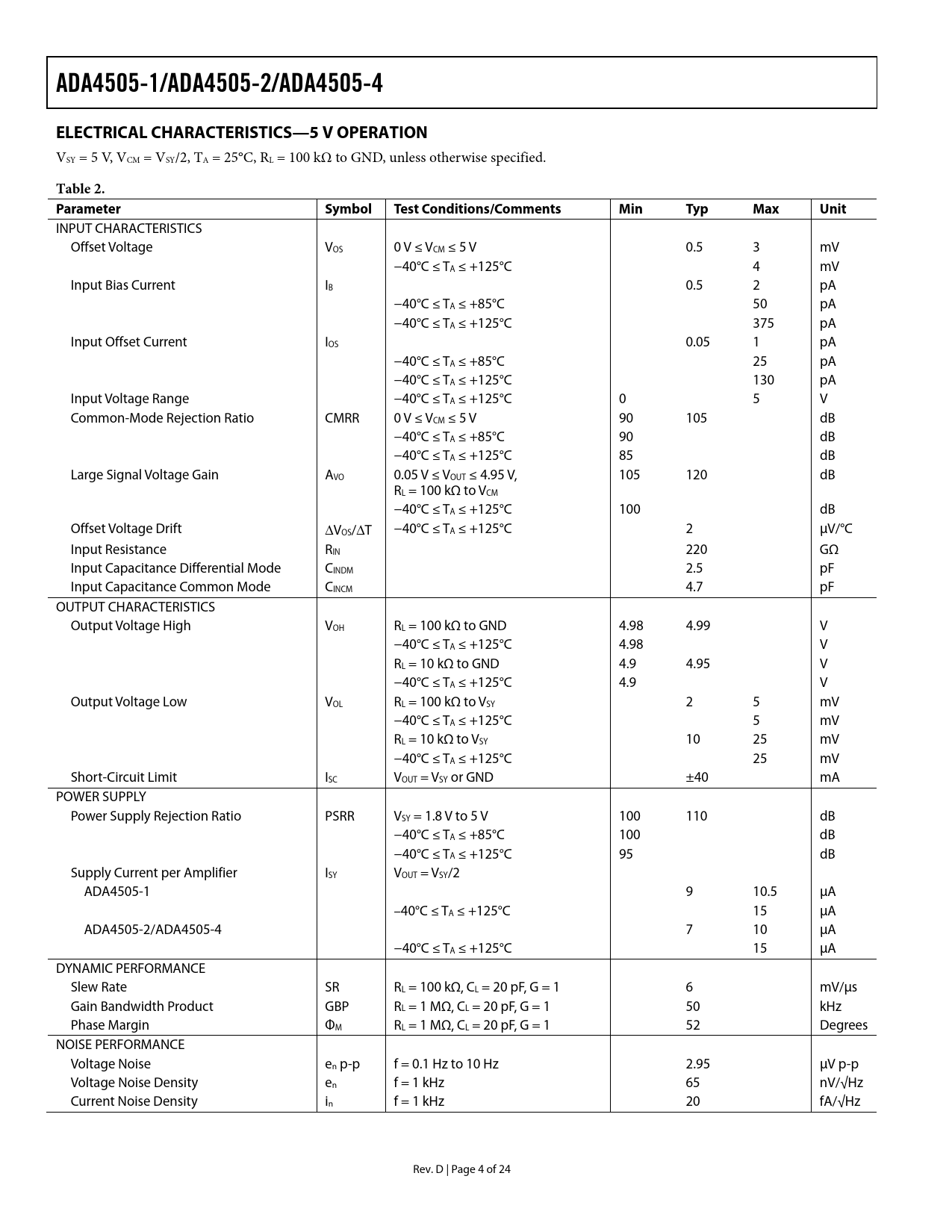 ADA4505-1/ADA4505-2/ADA4505-4 ELECTRICAL CHARACTERISTICS—5 V OPERATION Table 2 Parameter Symbol Test Conditions/Comments