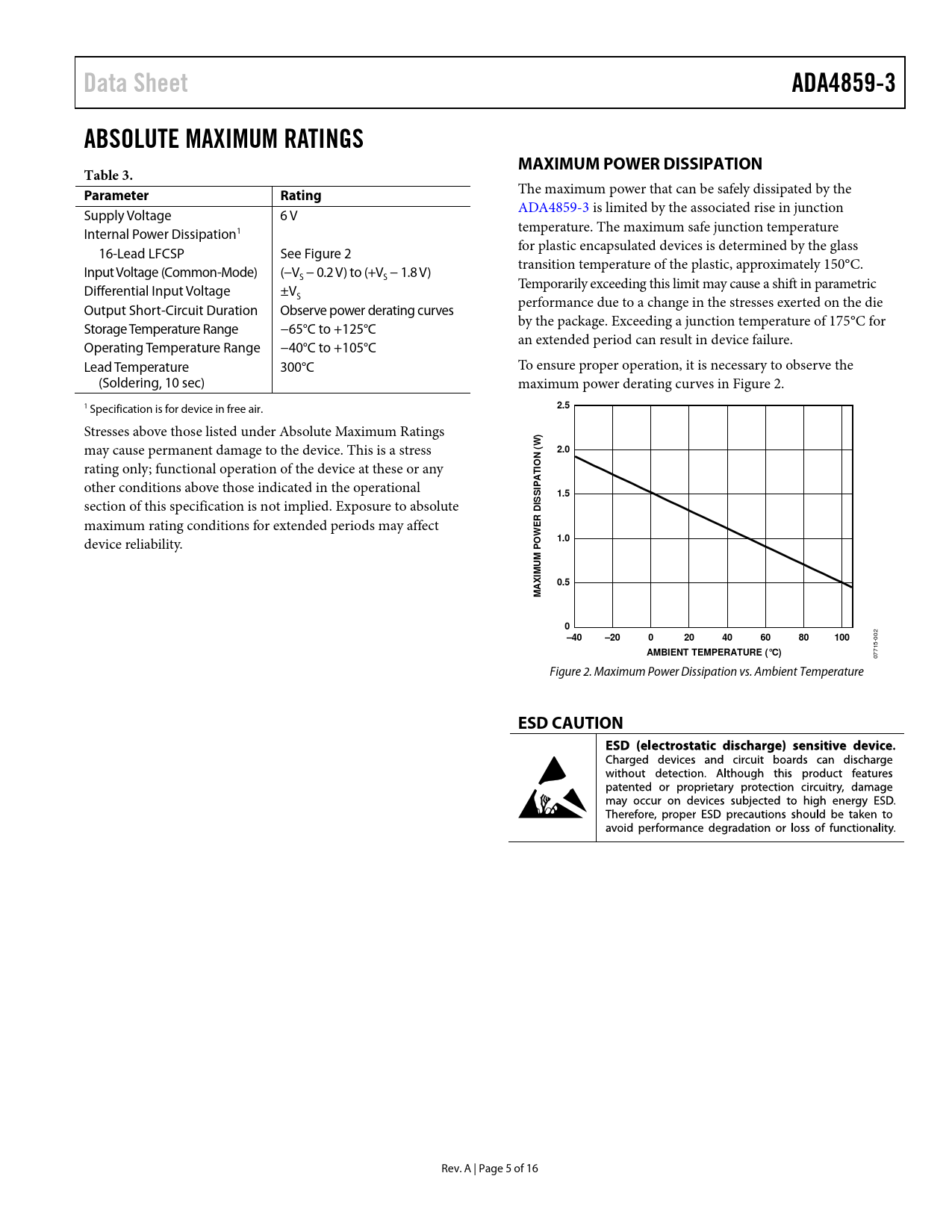 Data Sheet. ADA4859-3. ABSOLUTE MAXIMUM RATINGS. MAXIMUM POWER DISSIPATION. Table 3. Parameter. Rating. 2.5. 2.0. IO T. 1.5. ISSI D. ER W. 1.0