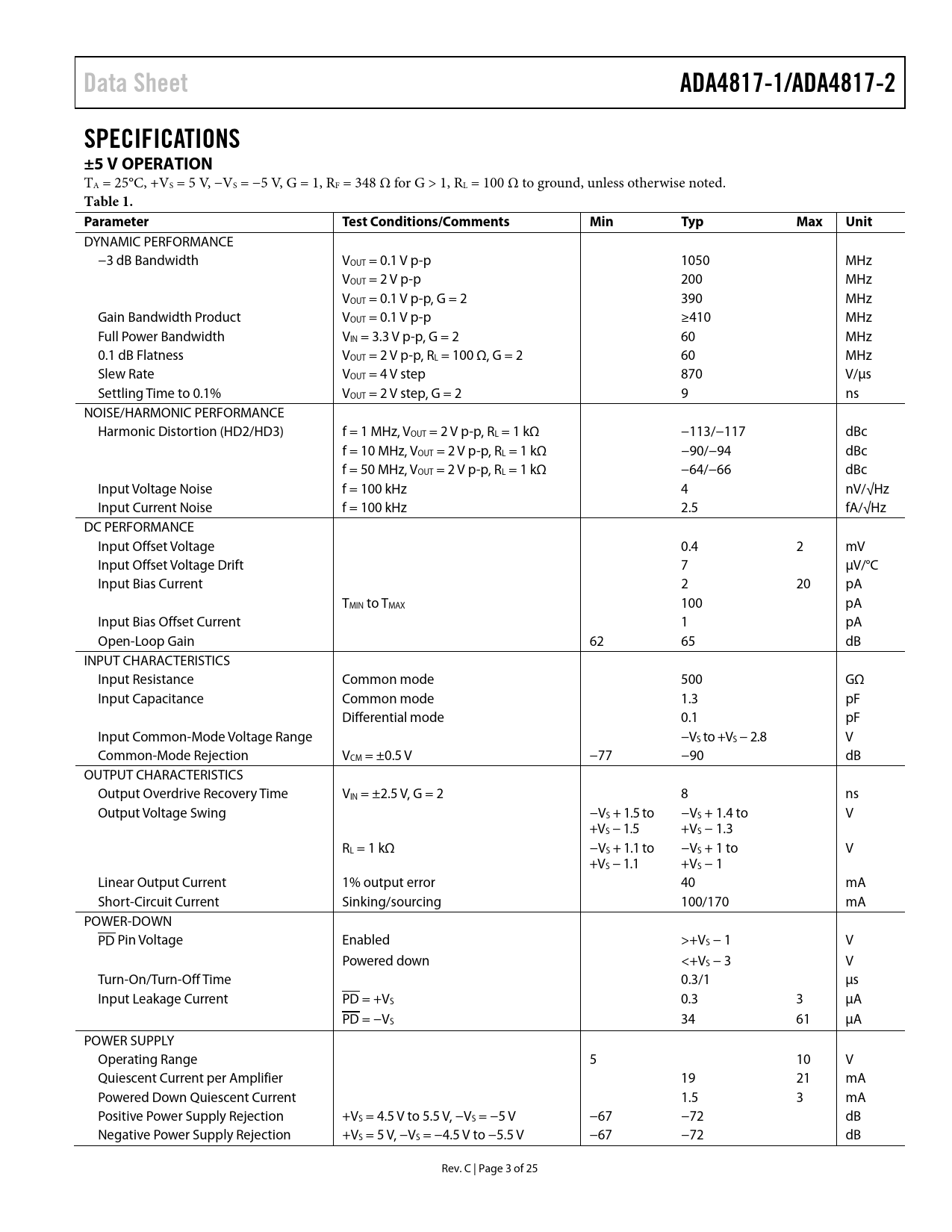 Data SheetADA4817-1/ADA4817-2SPECIFICATIONS ±5 V OPERATION TA = 25°C, +VS = 5 V, −VS = −5 V, G = 1, RF = 348 Ω for G > 1, RL = 100 Ω to ground, unless otherwise noted. Table 1. ParameterTest Conditions/CommentsMinTypMaxUnit DYNAMIC PERFORMANCE −3 dB Bandwidth VOUT = 0.1 V p-p 1050 MHz VOUT = 2 V p-p 200 MHz VOUT = 0.1 V p-p, G = 2 390 MHz Gain Bandwidth Product VOUT = 0.1 V p-p ≥410 MHz Full Power Bandwidth VIN = 3.3 V p-p, G = 2 60 MHz 0.1 dB Flatness VOUT = 2 V p-p, RL = 100 Ω, G = 2 60 MHz Slew Rate VOUT = 4 V step 870 V/µs Settling Time to 0.1% VOUT = 2 V step, G = 2 9 ns NOISE/HARMONIC PERFORMANCE Harmonic Distortion (HD2/HD3) f = 1 MHz, VOUT = 2 V p-p, RL = 1 kΩ −113/−117 dBc f = 10 MHz, VOUT = 2 V p-p, RL = 1 kΩ −90/−94 dBc f = 50 MHz, VOUT = 2 V p-p, RL = 1 kΩ −64/−66 dBc Input Voltage Noise f = 100 kHz 4 nV/√Hz Input Current Noise f = 100 kHz 2.5 fA/√Hz DC PERFORMANCE Input Offset Voltage 0.4 2 mV Input Offset Voltage Drift 7 µV/°C Input Bias Current 2 20 pA TMIN to TMAX 100 pA Input Bias Offset Current 1 pA Open-Loop Gain 62 65 dB INPUT CHARACTERISTICS Input Resistance Common mode 500 GΩ Input Capacitance Common mode 1.3 pF Differential mode 0.1 pF Input Common-Mode Voltage Range −VS to +VS − 2.8 V Common-Mode Rejection VCM = ±0.5 V −77 −90 dB OUTPUT CHARACTERISTICS Output Overdrive Recovery Time VIN = ±2.5 V, G = 2 8 ns Output Voltage Swing −VS + 1.5 to −VS + 1.4 to V +VS − 1.5 +VS − 1.3 RL = 1 kΩ −VS + 1.1 to −VS + 1 to V +VS − 1.1 +VS − 1 Linear Output Current 1% output error 40 mA Short-Circuit Current Sinking/sourcing 100/170 mA POWER-DOWN PD Pin Voltage Enabled >+VS − 1 V Powered down <+VS − 3 V Turn-On/Turn-Off Time 0.3/1 µs Input Leakage Current PD = +VS 0.3 3 µA PD = −VS 34 61 µA POWER SUPPLY Operating Range 5 10 V Quiescent Current per Amplifier 19 21 mA Powered Down Quiescent Current 1.5 3 mA Positive Power Supply Rejection +VS = 4.5 V to 5.5 V, −VS = −5 V −67 −72 dB Negative Power Supply Rejection +VS = 5 V, −VS = −4.5 V to −5.5 V −67 −72 dB Rev. C | Page 3 of 25 Document Outline FEATURES APPLICATIONS CONNECTION DIAGRAMS GENERAL DESCRIPTION TABLE OF CONTENTS REVISION HISTORY SPECIFICATIONS ±5 V OPERATION 5 V OPERATION ABSOLUTE MAXIMUM RATINGS THERMAL RESISTANCE MAXIMUM SAFE POWER DISSIPATION ESD CAUTION PIN CONFIGURATIONS AND FUNCTION DESCRIPTIONS TYPICAL PERFORMANCE CHARACTERISTICS TEST CIRCUITS THEORY OF OPERATION CLOSED-LOOP FREQUENCY RESPONSE NONINVERTING CLOSED-LOOP FREQUENCY RESPONSE INVERTING CLOSED-LOOP FREQUENCY RESPONSE WIDEBAND OPERATION DRIVING CAPACITIVE LOADS THERMAL CONSIDERATIONS POWER-DOWN OPERATION CAPACITIVE FEEDBACK HIGHER FREQUENCY ATTENUATION LAYOUT, GROUNDING, AND BYPASSING CONSIDERATIONS SIGNAL ROUTING POWER SUPPLY BYPASSING GROUNDING EXPOSED PADDLE LEAKAGE CURRENTS INPUT CAPACITANCE INPUT-TO-INPUT/OUTPUT COUPLING APPLICATIONS INFORMATION LOW DISTORTION PINOUT WIDEBAND PHOTODIODE PREAMP HIGH SPEED JFET INPUT INSTRUMENTATION AMPLIFIER ACTIVE LOW-PASS FILTER (LPF) OUTLINE DIMENSIONS ORDERING GUIDE