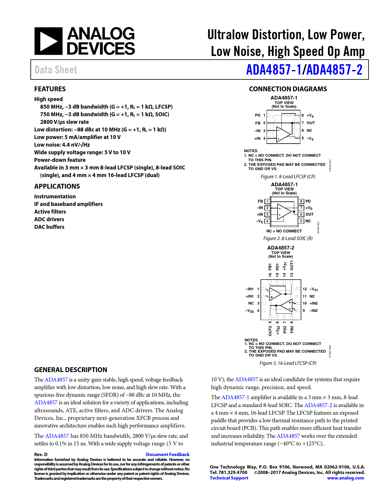 Ultralow Distortion, Low Power,. Low Noise, High Speed Op Amp. Data Sheet. ADA4857-1. /ADA4857-2. FEATURES. CONNECTION DIAGRAMS