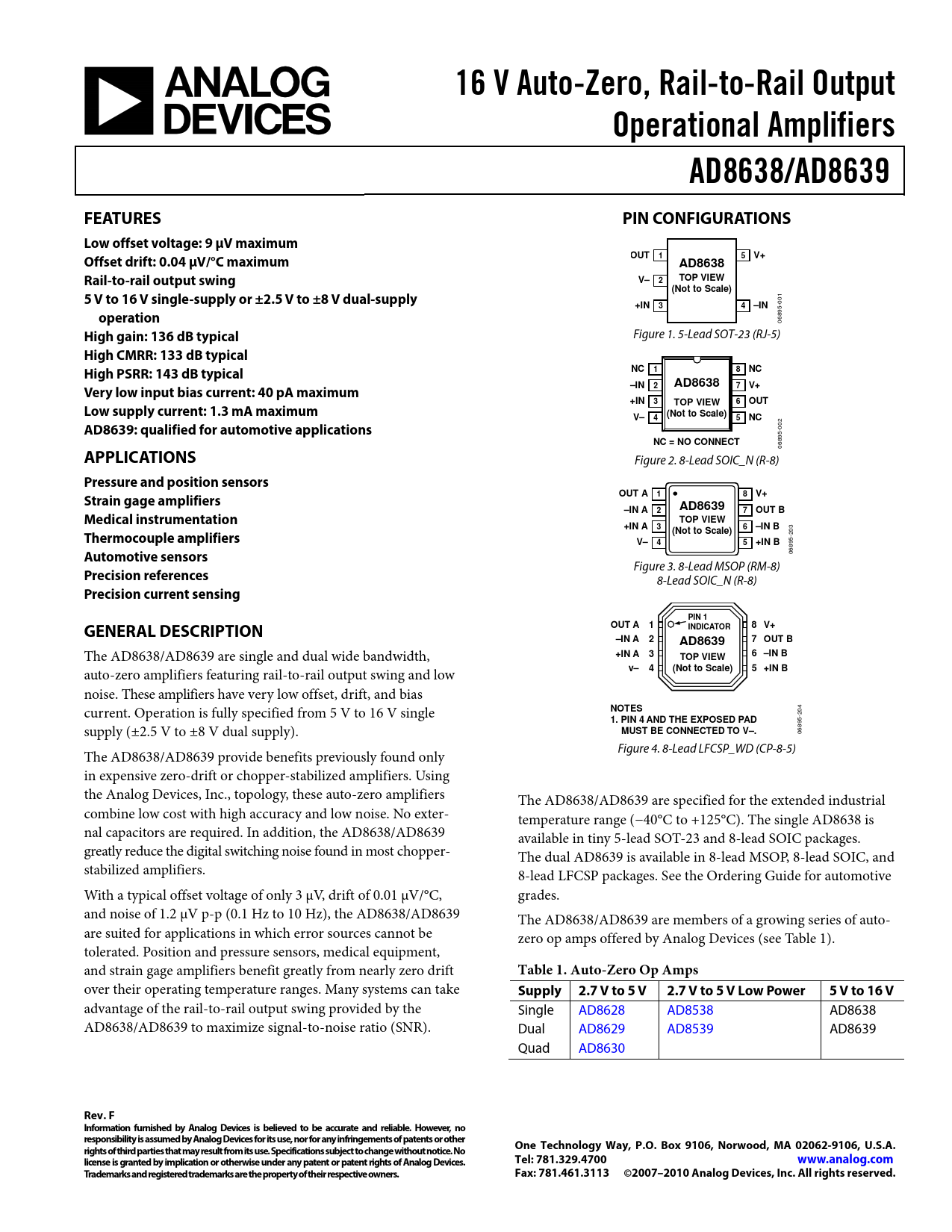 16 V Auto-Zero, Rail-to-Rail Output. Operational Amplifiers. AD8638/AD8639. FEATURES. PIN CONFIGURATIONS