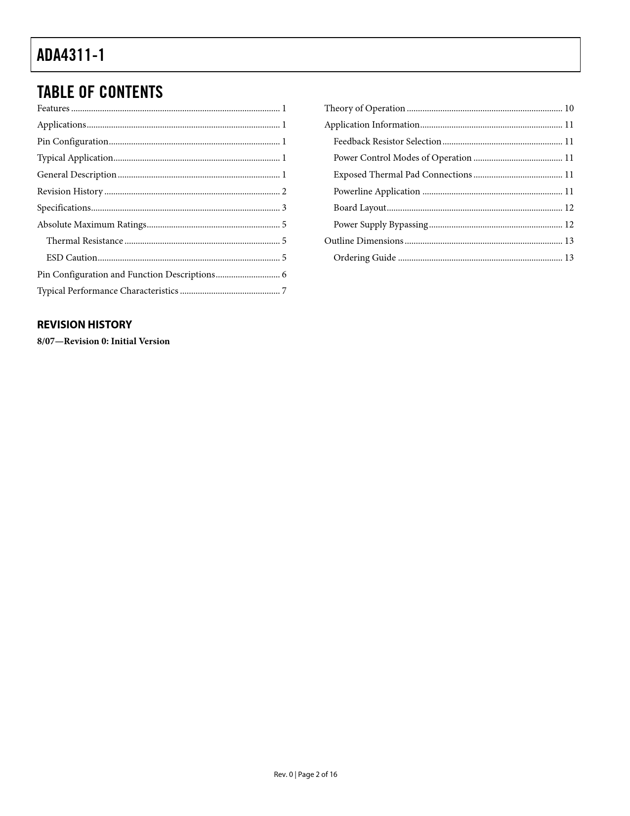 ADA4311-1 TABLE OF CONTENTS REVISION HISTORY 8/07—Revision 0: Initial Version