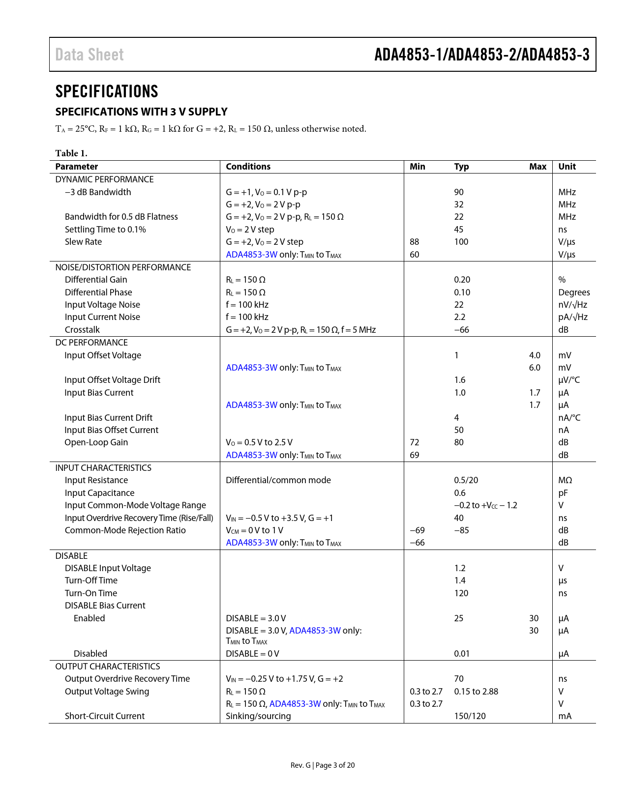 Data SheetADA4853-1/ADA4853-2/ADA4853-3SPECIFICATIONS SPECIFICATIONS WITH 3 V SUPPLY TA = 25°C, RF = 1 kΩ, RG = 1 kΩ for G = +2, RL = 150 Ω, unless otherwise noted. Table 1. ParameterConditionsMinTypMax Unit DYNAMIC PERFORMANCE −3 dB Bandwidth G = +1, VO = 0.1 V p-p 90 MHz G = +2, VO = 2 V p-p 32 MHz Bandwidth for 0.5 dB Flatness G = +2, VO = 2 V p-p, RL = 150 Ω 22 MHz Settling Time to 0.1% VO = 2 V step 45 ns Slew Rate G = +2, VO = 2 V step 88 100 V/µs ADA4853-3W only: TMIN to TMAX 60 V/µs NOISE/DISTORTION PERFORMANCE Differential Gain RL = 150 Ω 0.20 % Differential Phase RL = 150 Ω 0.10 Degrees Input Voltage Noise f = 100 kHz 22 nV/√Hz Input Current Noise f = 100 kHz 2.2 pA/√Hz Crosstalk G = +2, VO = 2 V p-p, RL = 150 Ω, f = 5 MHz −66 dB DC PERFORMANCE Input Offset Voltage 1 4.0 mV ADA4853-3W only: TMIN to TMAX 6.0 mV Input Offset Voltage Drift 1.6 µV/°C Input Bias Current 1.0 1.7 µA ADA4853-3W only: TMIN to TMAX 1.7 µA Input Bias Current Drift 4 nA/°C Input Bias Offset Current 50 nA Open-Loop Gain VO = 0.5 V to 2.5 V 72 80 dB ADA4853-3W only: TMIN to TMAX 69 dB INPUT CHARACTERISTICS Input Resistance Differential/common mode 0.5/20 MΩ Input Capacitance 0.6 pF Input Common-Mode Voltage Range −0.2 to +VCC − 1.2 V Input Overdrive Recovery Time (Rise/Fal ) VIN = −0.5 V to +3.5 V, G = +1 40 ns Common-Mode Rejection Ratio VCM = 0 V to 1 V −69 −85 dB ADA4853-3W only: TMIN to TMAX −66 dB DISABLE DISABLE Input Voltage 1.2 V Turn-Off Time 1.4 µs Turn-On Time 120 ns DISABLE Bias Current Enabled DISABLE = 3.0 V 25 30 µA DISABLE = 3.0 V, ADA4853-3W only: 30 µA TMIN to TMAX Disabled DISABLE = 0 V 0.01 µA OUTPUT CHARACTERISTICS Output Overdrive Recovery Time VIN = −0.25 V to +1.75 V, G = +2 70 ns Output Voltage Swing RL = 150 Ω 0.3 to 2.7 0.15 to 2.88 V RL = 150 Ω, ADA4853-3W only: TMIN to TMAX 0.3 to 2.7 V Short-Circuit Current Sinking/sourcing 150/120 mA Rev. G | Page 3 of 20 Document Outline FEATURES APPLICATIONS PIN CONFIGURATIONS GENERAL DESCRIPTION TABLE OF CONTENTS REVISION HISTORY SPECIFICATIONS SPECIFICATIONS WITH 3 V SUPPLY SPECIFICATIONS WITH 5 V SUPPLY ABSOLUTE MAXIMUM RATINGS THERMAL RESISTANCE Maximum Power Dissipation ESD CAUTION TYPICAL PERFORMANCE CHARACTERISTICS CIRCUIT DESCRIPTION HEADROOM CONSIDERATIONS OVERLOAD BEHAVIOR AND RECOVERY Input APPLICATIONS INFORMATION SINGLE-SUPPLY VIDEO AMPLIFIER POWER SUPPLY BYPASSING LAYOUT OUTLINE DIMENSIONS ORDERING GUIDE AUTOMOTIVE PRODUCTS