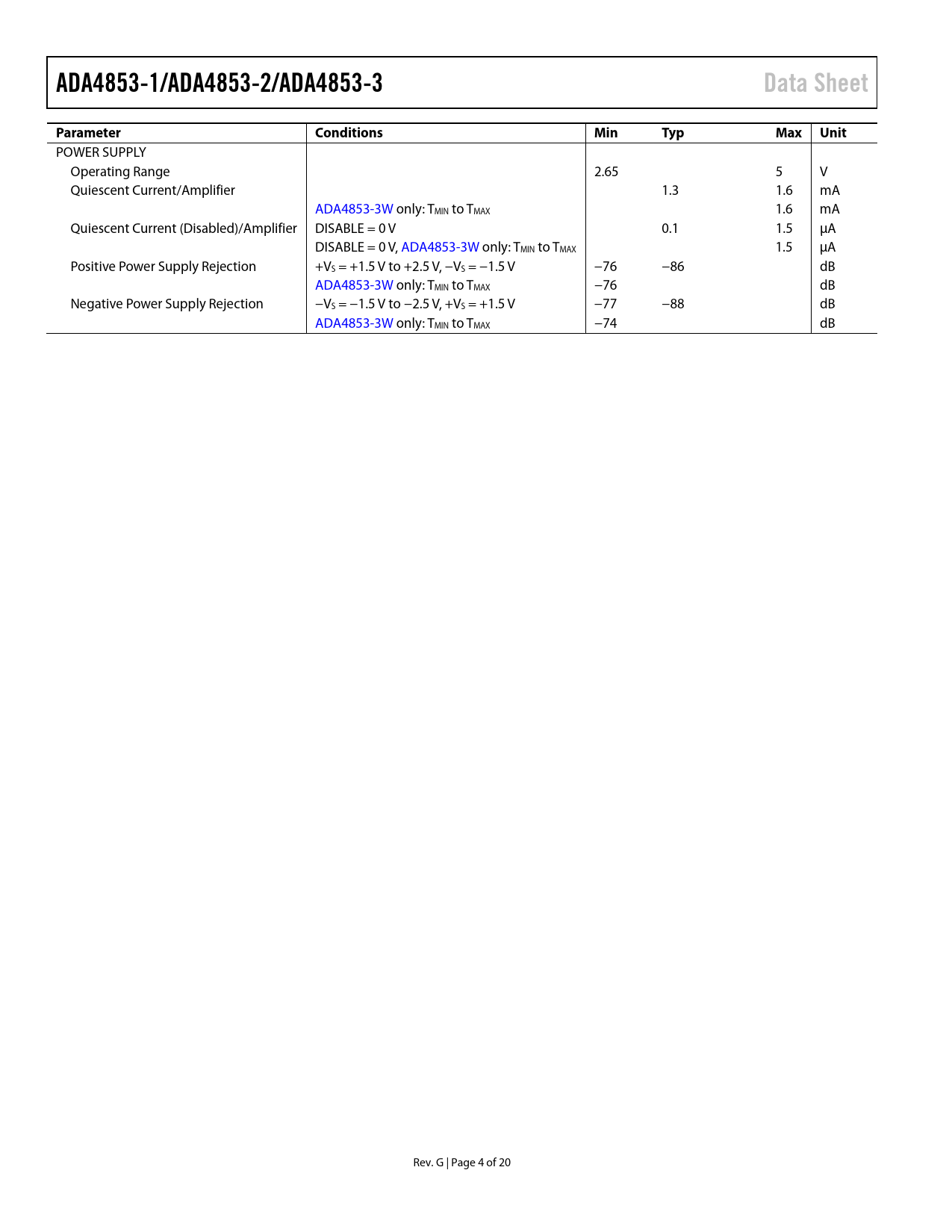 Seiten / Seite20 / 4 — ADA4853-1/ADA4853-2/ADA4853-3. Data Sheet. Parameter. Conditions. Min. …