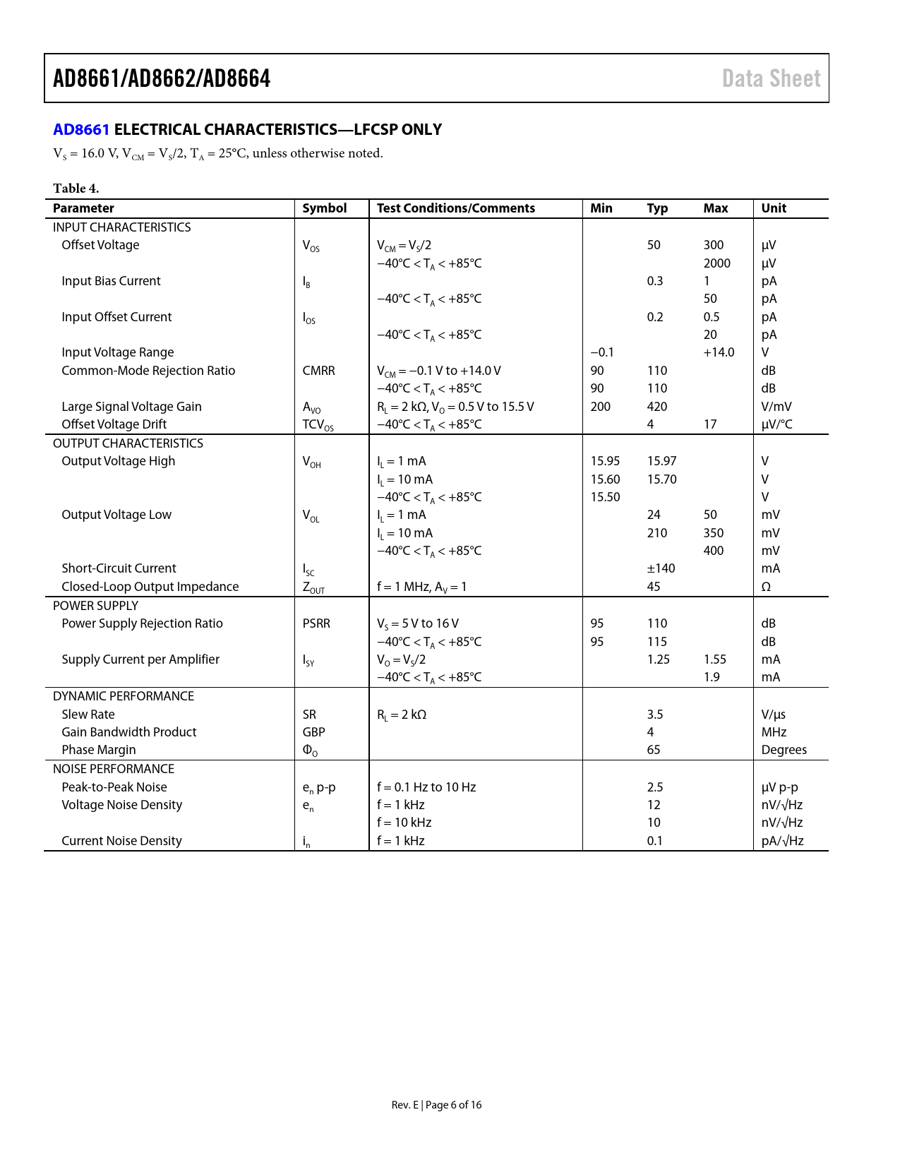 AD8661/AD8662/AD8664. Data Sheet. AD8661. ELECTRICAL CHARACTERISTICS—LFCSP ONLY. Table 4. Parameter. Symbol