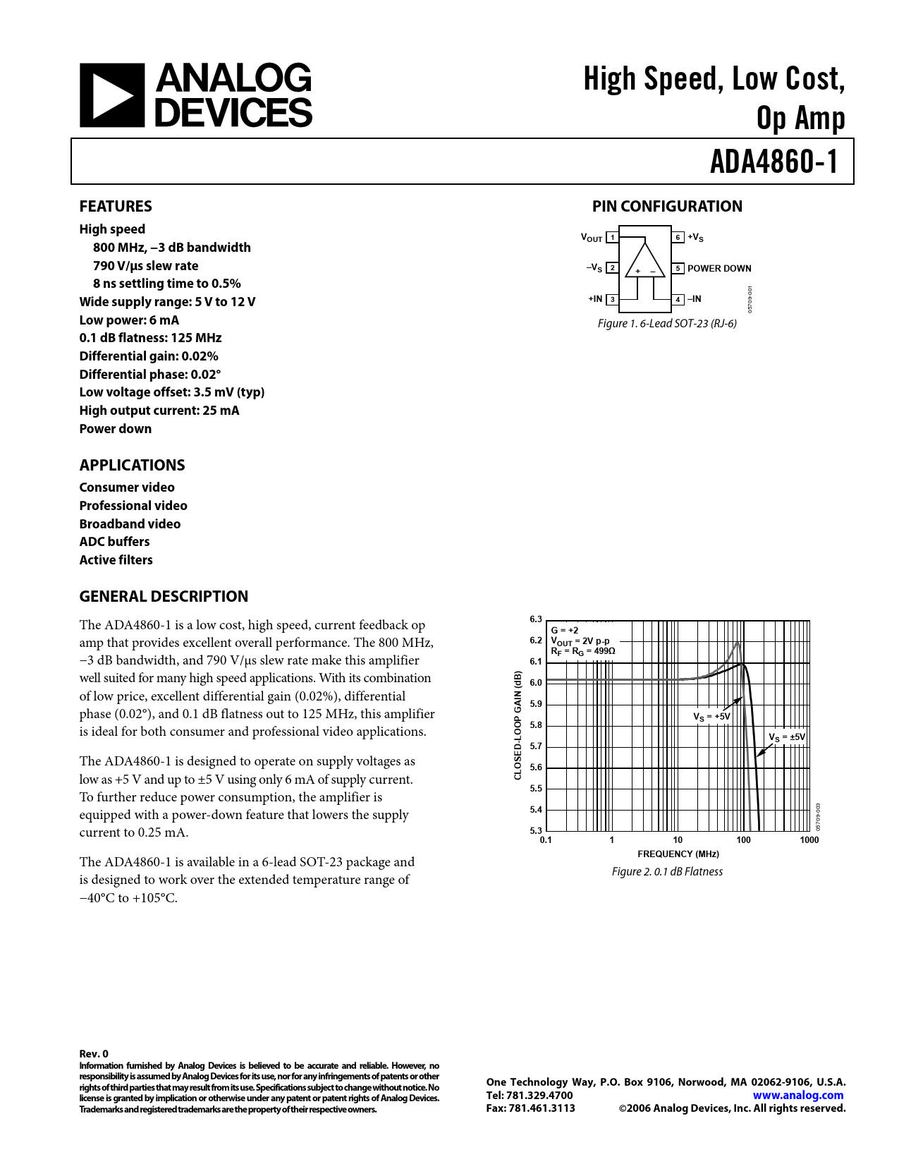 High Speed, Low Cost,. Op Amp. ADA4860-1. FEATURES. PIN CONFIGURATION. High speed. VOUT 1. 6 +VS