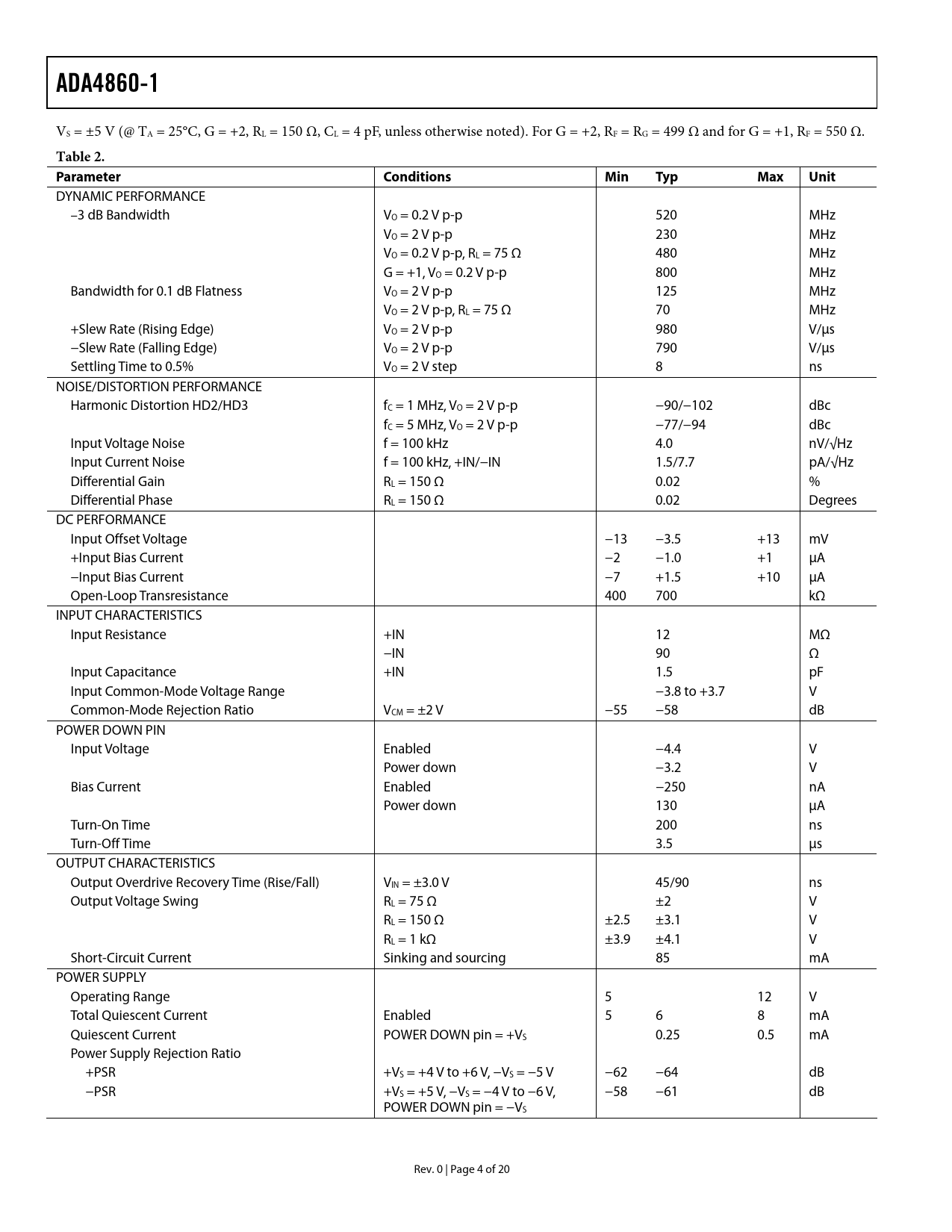 ADA4860-1 Table 2 Parameter Conditions Min Typ Max Unit