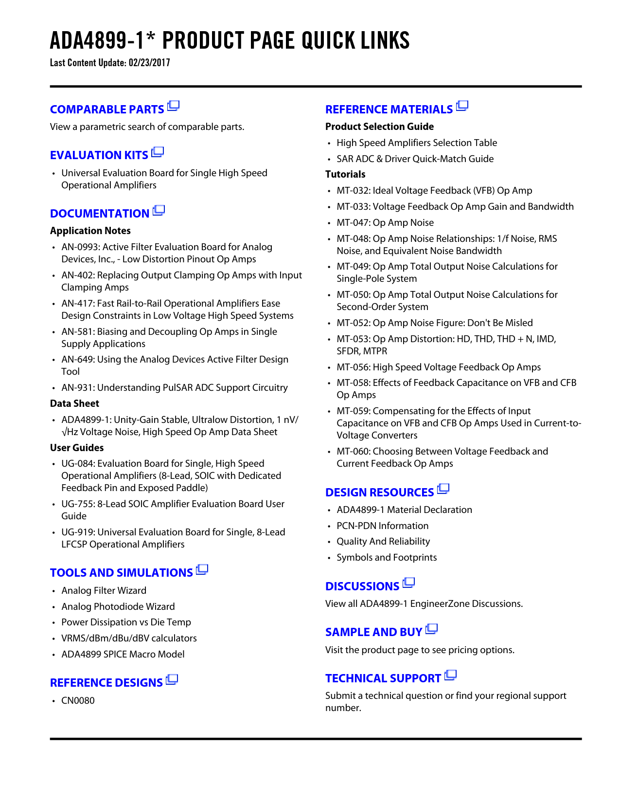 ADA4899-1* PRODUCT PAGE QUICK LINKS Last Content Update: 02/23/2017. COMPARABLE PARTS. REFERENCE MATERIALS