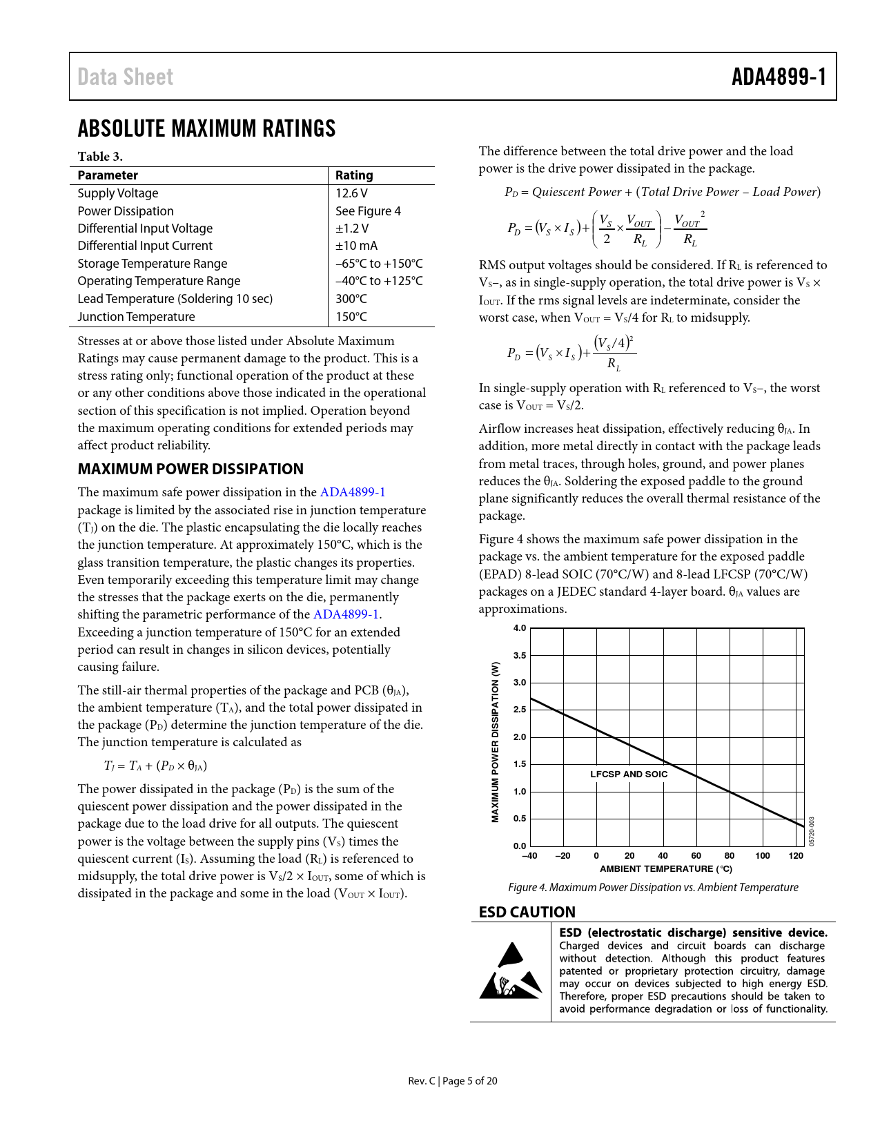 Data Sheet. ADA4899-1. ABSOLUTE MAXIMUM RATINGS Table 3. Parameter. Rating. MAXIMUM POWER DISSIPATION. 4.0. 3.5. 3.0. IO T. 2.5. ISSI. 2.0. 1.5