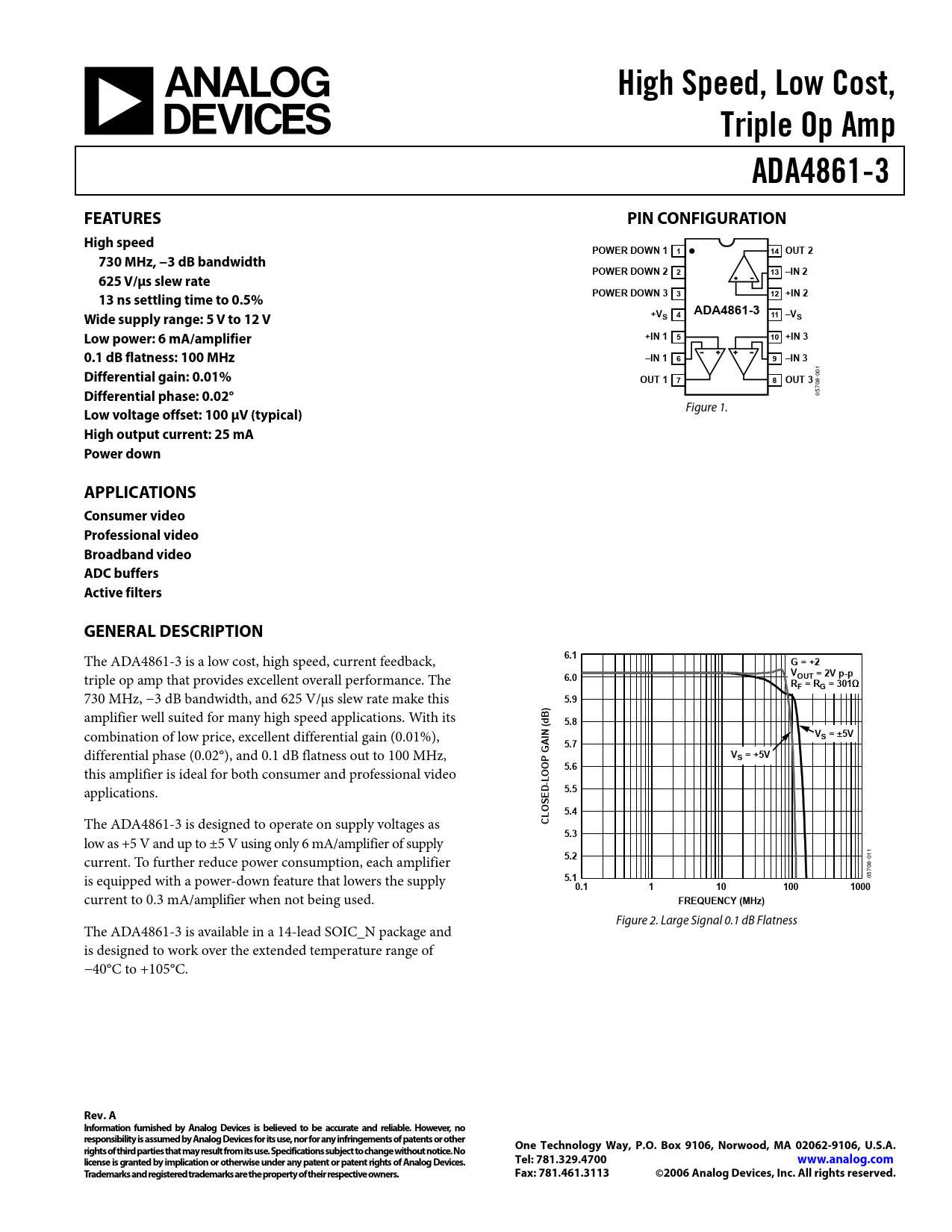 High Speed, Low Cost,. Triple Op Amp. ADA4861-3. FEATURES. PIN CONFIGURATION. High speed. POWER DOWN 1 1. 14 OUT 2