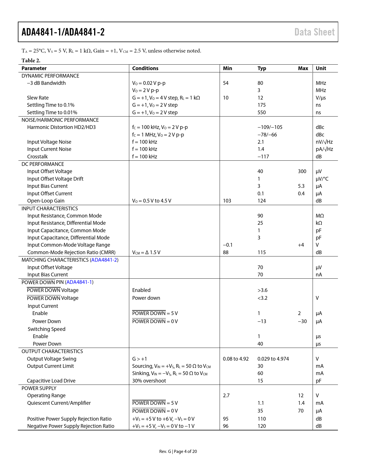 ADA4841-1/ADA4841-2. Data Sheet. Table 2. Parameter. Conditions. Min. Typ. Max. Unit