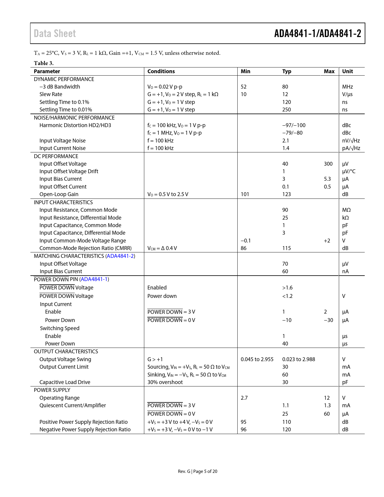Data SheetADA4841-1/ADA4841-2 TA = 25°C, VS = 3 V, RL = 1 kΩ, Gain =+1, VCM = 1.5 V, unless otherwise noted. Table 3. ParameterConditionsMinTypMax Unit DYNAMIC PERFORMANCE −3 dB Bandwidth VO = 0.02 V p-p 52 80 MHz Slew Rate G = +1, VO = 2 V step, RL = 1 kΩ 10 12 V/µs Settling Time to 0.1% G = +1, VO = 1 V step 120 ns Settling Time to 0.01% G = +1, VO = 1 V step 250 ns NOISE/HARMONIC PERFORMANCE Harmonic Distortion HD2/HD3 fC = 100 kHz, VO = 1 V p-p −97/−100 dBc fC = 1 MHz, VO = 1 V p-p −79/−80 dBc Input Voltage Noise f = 100 kHz 2.1 nV/√Hz Input Current Noise f = 100 kHz 1.4 pA/√Hz DC PERFORMANCE Input Offset Voltage 40 300 µV Input Offset Voltage Drift 1 µV/°C Input Bias Current 3 5.3 µA Input Offset Current 0.1 0.5 µA Open-Loop Gain VO = 0.5 V to 2.5 V 101 123 dB INPUT CHARACTERISTICS Input Resistance, Common Mode 90 MΩ Input Resistance, Differential Mode 25 kΩ Input Capacitance, Common Mode 1 pF Input Capacitance, Differential Mode 3 pF Input Common-Mode Voltage Range −0.1 +2 V Common-Mode Rejection Ratio (CMRR) VCM = 0.4 V 86 115 dB MATCHING CHARACTERISTICS (ADA4841-2) Input Offset Voltage 70 µV Input Bias Current 60 nA POWER DOWN PIN (ADA4841-1) POWER DOWN Voltage Enabled >1.6 POWER DOWN Voltage Power down <1.2 V Input Current Enable POWER DOWN = 3 V 1 2 µA Power Down POWER DOWN = 0 V −10 −30 µA Switching Speed Enable 1 µs Power Down 40 µs OUTPUT CHARACTERISTICS Output Voltage Swing G > +1 0.045 to 2.955 0.023 to 2.988 V Output Current Limit Sourcing, VIN = +VS, RL = 50 Ω to VCM 30 mA Sinking, VIN = −VS, RL = 50 Ω to VCM 60 mA Capacitive Load Drive 30% overshoot 30 pF POWER SUPPLY Operating Range 2.7 12 V Quiescent Current/Amplifier POWER DOWN = 3 V 1.1 1.3 mA POWER DOWN = 0 V 25 60 µA Positive Power Supply Rejection Ratio +VS = +3 V to +4 V, −VS = 0 V 95 110 dB Negative Power Supply Rejection Ratio +VS = +3 V, −VS = 0 V to −1 V 96 120 dB Rev. G | Page 5 of 20 Document Outline FEATURES APPLICATIONS CONNECTION DIAGRAMS GENERAL DESCRIPTION REVISION HISTORY SPECIFICATIONS ABSOLUTE MAXIMUM RATINGS THERMAL RESISTANCE MAXIMUM POWER DISSIPATION ESD CAUTION TYPICAL PERFORMANCE CHARACTERISTICS THEORY OF OPERATION AMPLIFIER DESCRIPTION DC ERRORS NOISE CONSIDERATIONS HEADROOM CONSIDERATIONS CAPACITANCE DRIVE INPUT PROTECTION POWER-DOWN OPERATION APPLICATIONS INFORMATION TYPICAL PERFORMANCE VALUES 16-BIT ADC DRIVER RECONSTRUCTION FILTER LAYOUT CONSIDERATIONS GROUND PLANE POWER SUPPLY BYPASSING OUTLINE DIMENSIONS ORDERING GUIDE