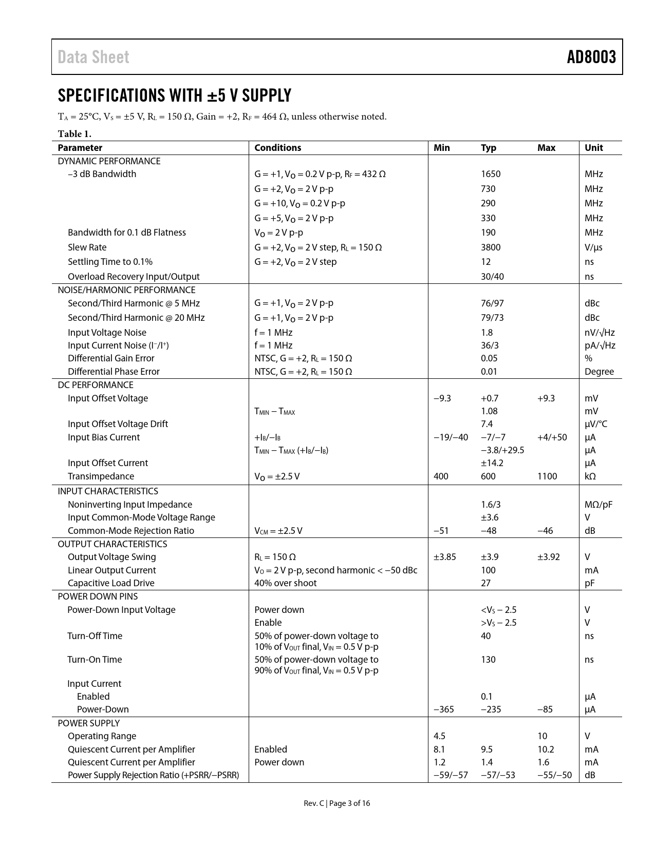 Data Sheet AD8003 SPECIFICATIONS WITH ±5 V SUPPLY