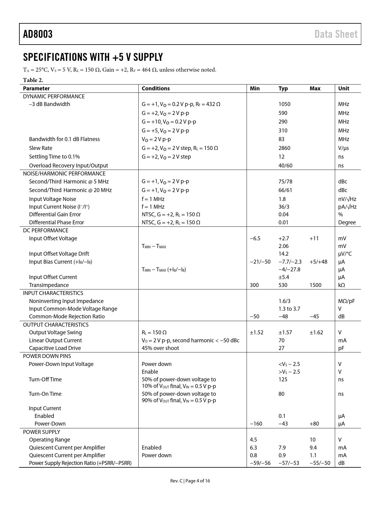 AD8003. Data Sheet. SPECIFICATIONS WITH +5 V SUPPLY. Table 2. Parameter. Conditions. Min. Typ. Max. Unit