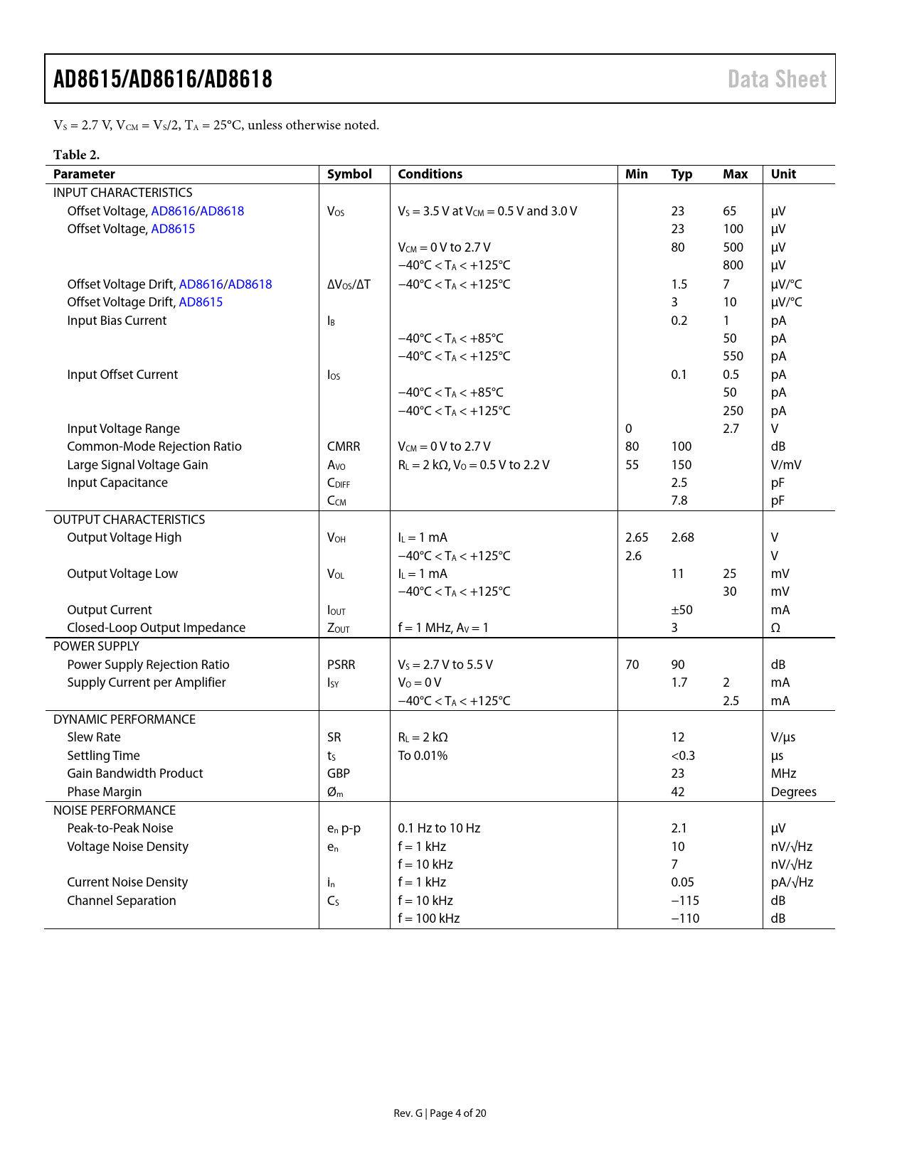 AD8615/AD8616/AD8618Data Sheet VS = 2.7 V, VCM = VS/2, TA = 25°C, unless otherwise noted. Table 2. ParameterSymbolConditionsMinTypMaxUnit INPUT CHARACTERISTICS Offset Voltage, AD8616/AD8618 VOS VS = 3.5 V at VCM = 0.5 V and 3.0 V 23 65 µV Offset Voltage, AD8615 23 100 µV VCM = 0 V to 2.7 V 80 500 µV −40°C < TA < +125°C 800 µV Offset Voltage Drift, AD8616/AD8618 ∆VOS/∆T −40°C < TA < +125°C 1.5 7 µV/°C Offset Voltage Drift, AD8615 3 10 µV/°C Input Bias Current IB 0.2 1 pA −40°C < TA < +85°C 50 pA −40°C < TA < +125°C 550 pA Input Offset Current IOS 0.1 0.5 pA −40°C < TA < +85°C 50 pA −40°C < TA < +125°C 250 pA Input Voltage Range 0 2.7 V Common-Mode Rejection Ratio CMRR VCM = 0 V to 2.7 V 80 100 dB Large Signal Voltage Gain AVO RL = 2 kΩ, VO = 0.5 V to 2.2 V 55 150 V/mV Input Capacitance CDIFF 2.5 pF CCM 7.8 pF OUTPUT CHARACTERISTICS Output Voltage High VOH IL = 1 mA 2.65 2.68 V −40°C < TA < +125°C 2.6 V Output Voltage Low VOL IL = 1 mA 11 25 mV −40°C < TA < +125°C 30 mV Output Current IOUT ±50 mA Closed-Loop Output Impedance ZOUT f = 1 MHz, AV = 1 3 Ω POWER SUPPLY Power Supply Rejection Ratio PSRR VS = 2.7 V to 5.5 V 70 90 dB Supply Current per Amplifier ISY VO = 0 V 1.7 2 mA −40°C < TA < +125°C 2.5 mA DYNAMIC PERFORMANCE Slew Rate SR RL = 2 kΩ 12 V/µs Settling Time tS To 0.01% <0.3 µs Gain Bandwidth Product GBP 23 MHz Phase Margin Øm 42 Degrees NOISE PERFORMANCE Peak-to-Peak Noise en p-p 0.1 Hz to 10 Hz 2.1 µV Voltage Noise Density en f = 1 kHz 10 nV/√Hz f = 10 kHz 7 nV/√Hz Current Noise Density in f = 1 kHz 0.05 pA/√Hz Channel Separation CS f = 10 kHz −115 dB f = 100 kHz −110 dB Rev. G | Page 4 of 20 Document Outline Features Applications General Description Pin Configuration Table of Contents Revision History Specifications Absolute Maximum Ratings Thermal Resistance ESD Caution Typical Performance Characteristics Applications Information Input Overvoltage Protection Output Phase Reversal Driving Capacitive Loads Overload Recovery Time D/A Conversion Low Noise Applications High Speed Photodiode Preamplifier Active Filters Power Dissipation Power Calculations for Varying or Unknown Loads Calculating Power by Measuring Ambient Temperature and Case Temperature Calculating Power by Measuring Supply Current Outline Dimensions Ordering Guide