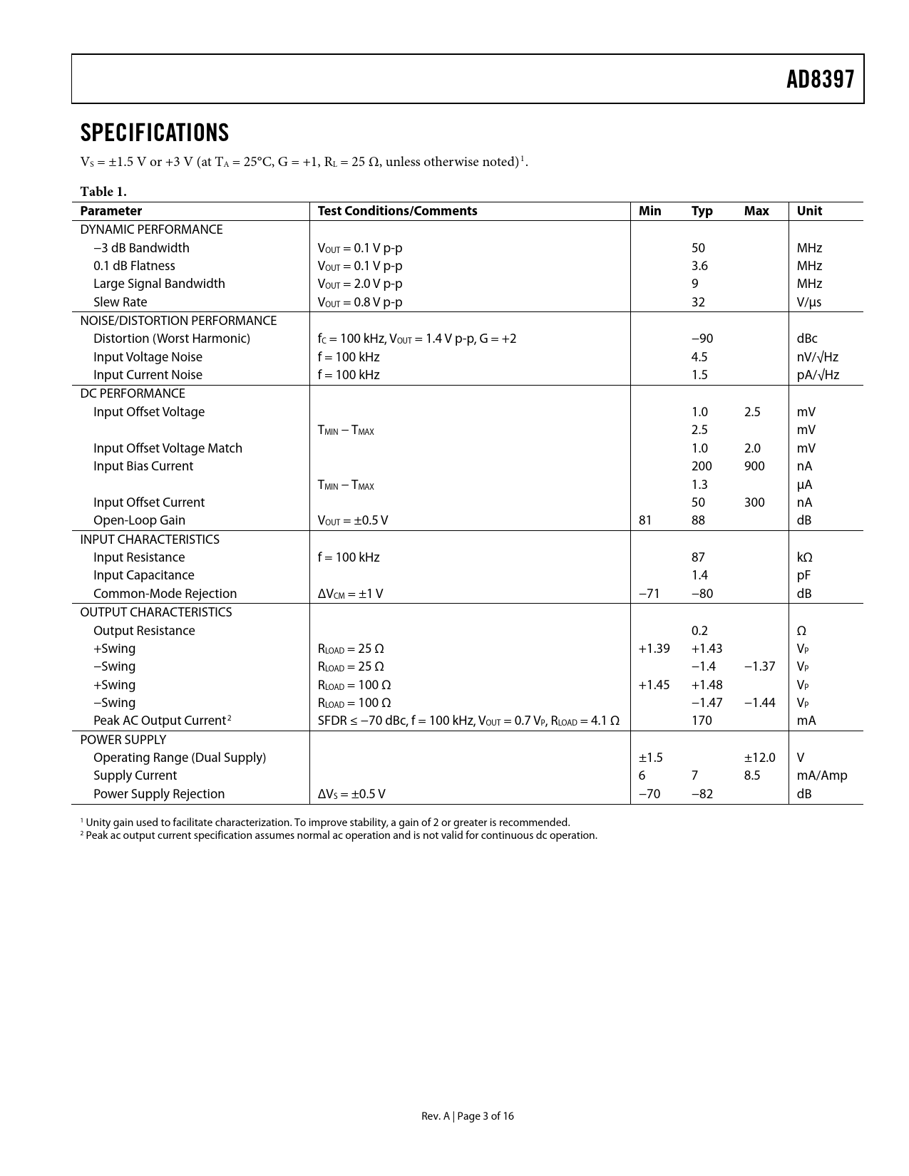 link to page 1 link to page 1 AD8397SPECIFICATIONS VS = ±1.5 V or +3 V (at TA = 25°C, G = +1, RL = 25 Ω, unless otherwise noted)1. Table 1. Parameter TestConditions/CommentsMinTypMaxUnit DYNAMIC PERFORMANCE −3 dB Bandwidth VOUT = 0.1 V p-p 50 MHz 0.1 dB Flatness VOUT = 0.1 V p-p 3.6 MHz Large Signal Bandwidth VOUT = 2.0 V p-p 9 MHz Slew Rate VOUT = 0.8 V p-p 32 V/μs NOISE/DISTORTION PERFORMANCE Distortion (Worst Harmonic) fC = 100 kHz, VOUT = 1.4 V p-p, G = +2 −90 dBc Input Voltage Noise f = 100 kHz 4.5 nV/√Hz Input Current Noise f = 100 kHz 1.5 pA/√Hz DC PERFORMANCE Input Offset Voltage 1.0 2.5 mV TMIN − TMAX 2.5 mV Input Offset Voltage Match 1.0 2.0 mV Input Bias Current 200 900 nA TMIN − TMAX 1.3 μA Input Offset Current 50 300 nA Open-Loop Gain VOUT = ±0.5 V 81 88 dB INPUT CHARACTERISTICS Input Resistance f = 100 kHz 87 kΩ Input Capacitance 1.4 pF Common-Mode Rejection ΔVCM = ±1 V −71 −80 dB OUTPUT CHARACTERISTICS Output Resistance 0.2 Ω +Swing RLOAD = 25 Ω +1.39 +1.43 VP −Swing RLOAD = 25 Ω −1.4 −1.37 VP +Swing RLOAD = 100 Ω +1.45 +1.48 VP −Swing RLOAD = 100 Ω −1.47 −1.44 VP Peak AC Output Current2 SFDR ≤ −70 dBc, f = 100 kHz, VOUT = 0.7 VP, RLOAD = 4.1 Ω 170 mA POWER SUPPLY Operating Range (Dual Supply) ±1.5 ±12.0 V Supply Current 6 7 8.5 mA/Amp Power Supply Rejection ΔVS = ±0.5 V −70 −82 dB 1 Unity gain used to facilitate characterization. To improve stability, a gain of 2 or greater is recommended. 2 Peak ac output current specification assumes normal ac operation and is not valid for continuous dc operation. Rev. A | Page 3 of 16 Document Outline FEATURES APPLICATIONS GENERAL DESCRIPTION PIN CONFIGURATION TABLE OF CONTENTS REVISION HISTORY SPECIFICATIONS ABSOLUTE MAXIMUM RATINGS MAXIMUM POWER DISSIPATION ESD CAUTION TYPICAL PERFORMANCE CHARACTERISTICS APPLICATIONS INFORMATION POWER SUPPLY AND DECOUPLING LAYOUT CONSIDERATIONS UNITY-GAIN OUTPUT SWING CAPACITIVE LOAD DRIVE OUTLINE DIMENSIONS ORDERING GUIDE
