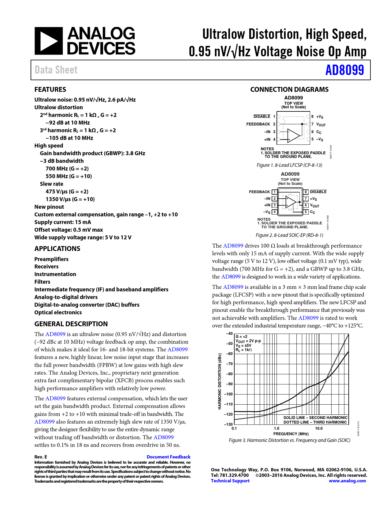 Ultralow Distortion, High Speed,. 0.95 nV/√Hz Voltage Noise Op Amp. Data Sheet. AD8099. FEATURES. CONNECTION DIAGRAMS