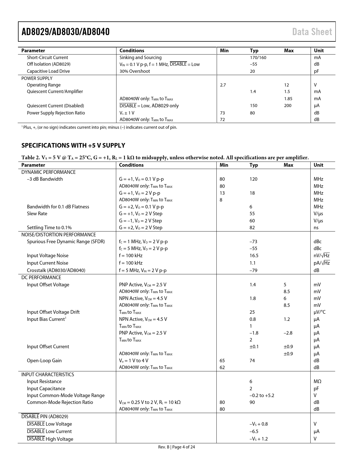 link to page 5 AD8029/AD8030/AD8040Data SheetParameterConditionsMinTypMaxUnit Short-Circuit Current Sinking and Sourcing 170/160 mA Off Isolation (AD8029) VIN = 0.1 V p-p, f = 1 MHz, DISABLE = Low –55 dB Capacitive Load Drive 30% Overshoot 20 pF POWER SUPPLY Operating Range 2.7 12 V Quiescent Current/Amplifier 1.4 1.5 mA AD8040W only: TMIN to TMAX 1.85 mA Quiescent Current (Disabled) DISABLE = Low, AD8029 only 150 200 µA Power Supply Rejection Ratio Vs ± 1 V 73 80 dB AD8040W only: TMIN to TMAX 72 dB 1 Plus, +, (or no sign) indicates current into pin; minus (–) indicates current out of pin. SPECIFICATIONS WITH +5 V SUPPLYTable 2. VS = 5 V @ TA = 25°C, G = +1, RL = 1 kΩ to midsupply, unless otherwise noted. All specifications are per amplifier. ParameterConditionsMinTypMaxUnit DYNAMIC PERFORMANCE –3 dB Bandwidth G = +1, VO = 0.1 V p-p 80 120 MHz AD8040W only: TMIN to TMAX 80 MHz G = +1, VO = 2 V p-p 13 18 MHz AD8040W only: TMIN to TMAX 8 MHz Bandwidth for 0.1 dB Flatness G = +2, VO = 0.1 V p-p 6 MHz Slew Rate G = +1, VO = 2 V Step 55 V/µs G = –1, VO = 2 V Step 60 V/µs Settling Time to 0.1% G = +2, VO = 2 V Step 82 ns NOISE/DISTORTION PERFORMANCE Spurious Free Dynamic Range (SFDR) fC = 1 MHz, VO = 2 V p-p –73 dBc fC = 5 MHz, VO = 2 V p-p –55 dBc Input Voltage Noise f = 100 kHz 16.5 nV/√Hz Input Current Noise f = 100 kHz 1.1 pA/√Hz Crosstalk (AD8030/AD8040) f = 5 MHz, VIN = 2 V p-p –79 dB DC PERFORMANCE Input Offset Voltage PNP Active, VCM = 2.5 V 1.4 5 mV AD8040W only: TMIN to TMAX 8.5 mV NPN Active, VCM = 4.5 V 1.8 6 mV AD8040W only: TMIN to TMAX 8.5 mV Input Offset Voltage Drift TMIN to TMAX 25 µV/°C Input Bias Current1 NPN Active, VCM = 4.5 V 0.8 1.2 µA TMIN to TMAX 1 µA PNP Active, VCM = 2.5 V –1.8 –2.8 µA TMIN to TMAX 2 µA Input Offset Current ±0.1 ±0.9 µA AD8040W only: TMIN to TMAX ±0.9 µA Open-Loop Gain Vo = 1 V to 4 V 65 74 dB AD8040W only: TMIN to TMAX 62 dB INPUT CHARACTERISTICS Input Resistance 6 MΩ Input Capacitance 2 pF Input Common-Mode Voltage Range –0.2 to +5.2 V Common-Mode Rejection Ratio VCM = 0.25 V to 2 V, RL = 10 kΩ 80 90 dB AD8040W only: TMIN to TMAX 80 dB DISABLE PIN (AD8029) DISABLE Low Voltage –VS + 0.8 V DISABLE Low Current –6.5 µA DISABLE High Voltage –VS + 1.2 V Rev. B | Page 4 of 24 Document Outline Features Applications Connection Diagrams General Description Table of Contents Revision History Specifications Specifications with ±5 V Supply Specifications with +5 V Supply Specifications with +3 V Supply Absolute Maximum Ratings Maximum Power Dissipation Output Short Circuit ESD Caution Typical Performance Characteristics Theory of Operation Input Stage Output Stage Applications Wideband Operation Output Loading Sensitivity Disable Pin Circuit Considerations PCB Layout Grounding Power Supply Bypassing Design Tools and Technical Support Outline Dimensions Ordering Guide