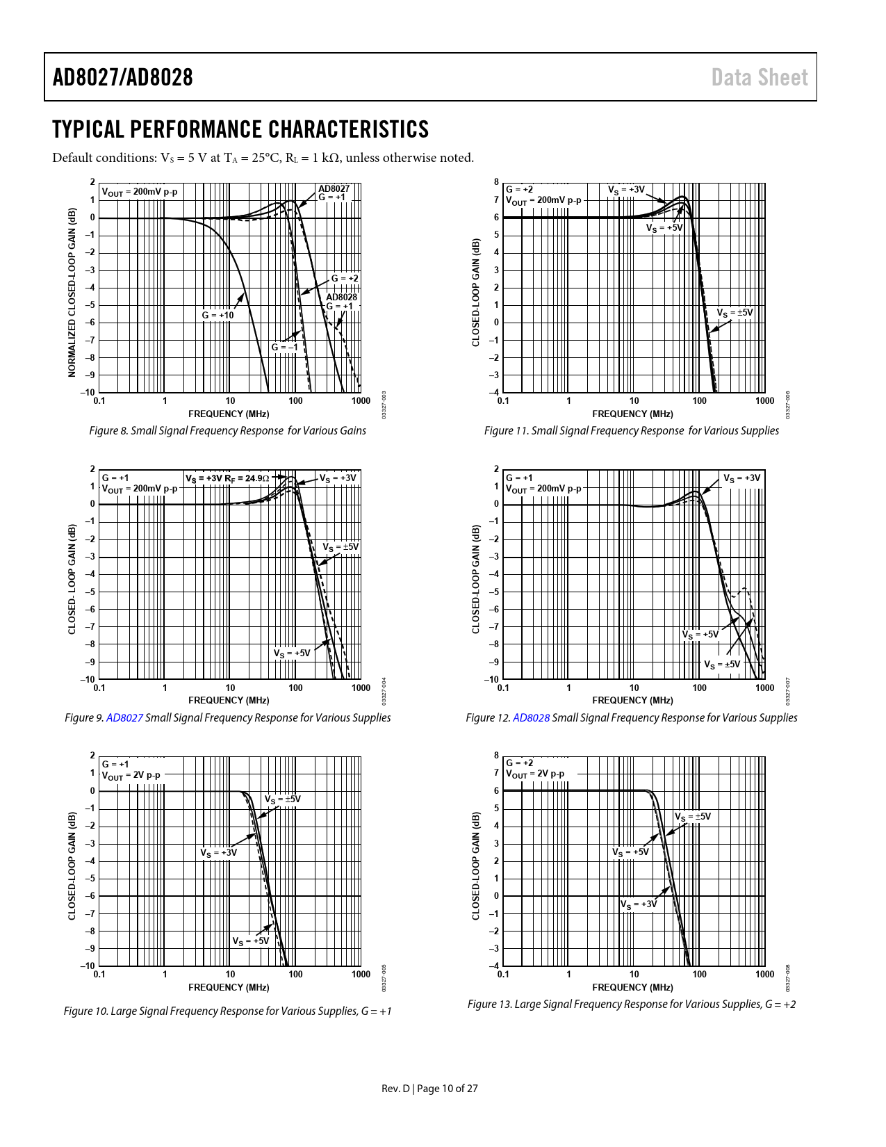 AD8027/AD8028 Data Sheet TYPICAL PERFORMANCE CHARACTERISTICS G = +2 OUT = 200mV p-p AD8027 S = +3V G = +1 7 VOUT = 200mV p-p