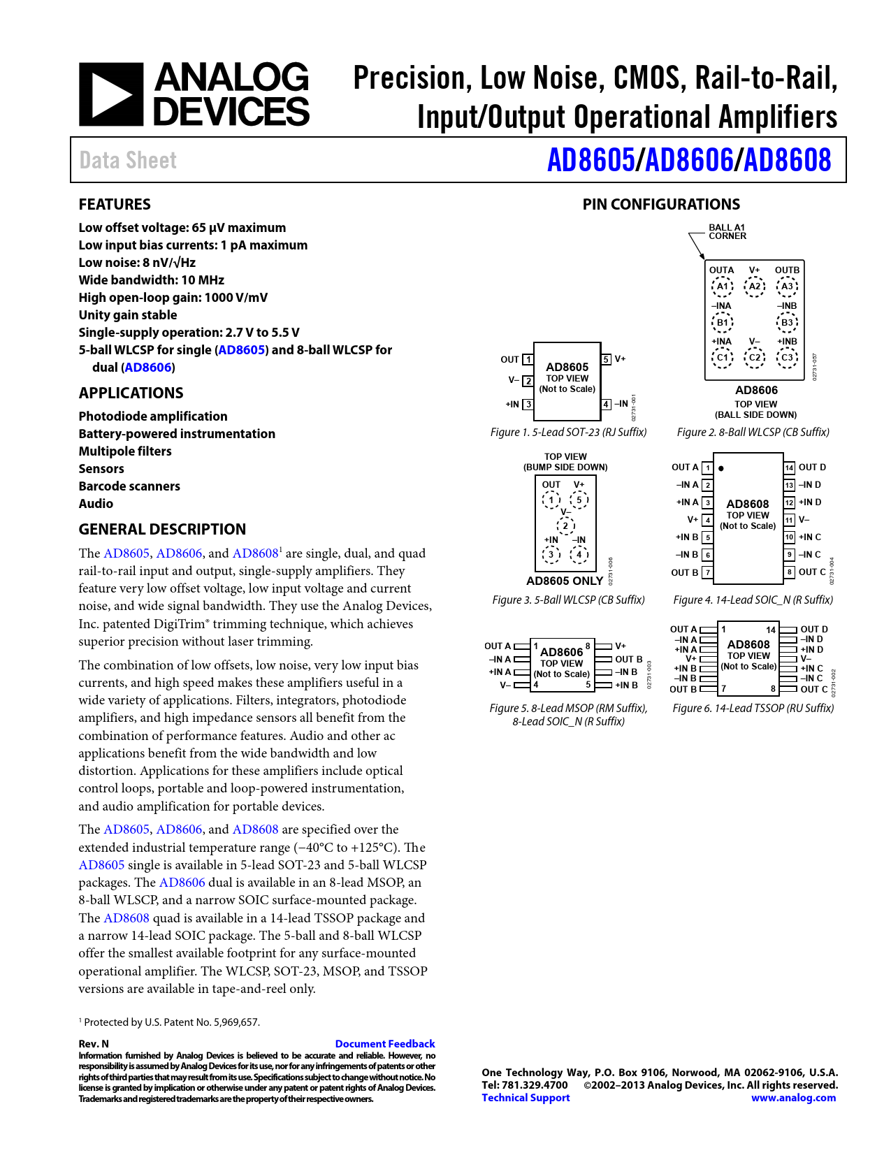 73 wide variety of applications. Filters, integrators, photodiode 02 Figure 5. 8-Lead MSOP (RM Suffix), Figure 6. 14-Lead TSSOP (RU Suffix) amplifiers, and high impedance sensors all benefit from the 8-Lead SOIC_N (R Suffix) combination of performance features. Audio and other ac applications benefit from the wide bandwidth and low distortion. Applications for these amplifiers include optical control loops, portable and loop-powered instrumentation, and audio amplification for portable devices. The AD8605, AD8606, and AD8608 are specified over the extended industrial temperature range (−40°C to +125°C). The AD8605 single is available in 5-lead SOT-23 and 5-ball WLCSP packages. The AD8606 dual is available in an 8-lead MSOP, an 8-ball WLSCP, and a narrow SOIC surface-mounted package. The AD8608 quad is available in a 14-lead TSSOP package and a narrow 14-lead SOIC package. The 5-ball and 8-ball WLCSP offer the smallest available footprint for any surface-mounted operational amplifier. The WLCSP, SOT-23, MSOP, and TSSOP versions are available in tape-and-reel only. 1 Protected by U.S. Patent No. 5,969,657.