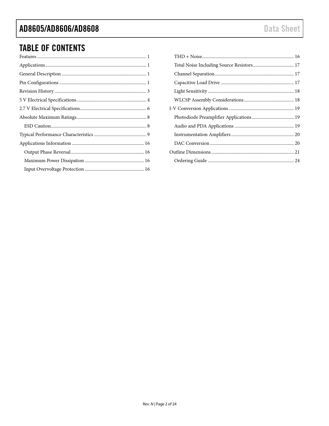 link to page 1 link to page 1 link to page 1 link to page 1 link to page 3 link to page 4 link to page 6 link to page 8 link to page 8 link to page 9 link to page 16 link to page 16 link to page 16 link to page 16 link to page 16 link to page 17 link to page 17 link to page 17 link to page 18 link to page 18 link to page 19 link to page 19 link to page 19 link to page 20 link to page 20 link to page 21 link to page 24 AD8605/AD8606/AD8608Data SheetTABLE OF CONTENTS Features .. 1 THD + Noise ... 16 Applications ... 1 Total Noise Including Source Resistors ... 17 General Description ... 1 Channel Separation .. 17 Pin Configurations ... 1 Capacitive Load Drive ... 17 Revision History ... 3 Light Sensitivity .. 18 5 V Electrical Specifications .. 4 WLCSP Assembly Considerations ... 18 2.7 V Electrical Specifications ... 6 I-V Conversion Applications .. 19 Absolute Maximum Ratings .. 8 Photodiode Preamplifier Applications .. 19 ESD Caution .. 8 Audio and PDA Applications ... 19 Typical Performance Characteristics ... 9 Instrumentation Amplifiers .. 20 Applications Information .. 16 DAC Conversion .. 20 Output Phase Reversal ... 16 Outline Dimensions ... 21 Maximum Power Dissipation ... 16 Ordering Guide .. 24 Input Overvoltage Protection ... 16 Rev. N | Page 2 of 24 Document Outline Features Applications General Description Pin Configurations Revision History 5 V Electrical Specifications 2.7 V Electrical Specifications Absolute Maximum Ratings ESD Caution Typical Performance Characteristics Applications Information Output Phase Reversal Maximum Power Dissipation Input Overvoltage Protection THD + Noise Total Noise Including Source Resistors Channel Separation Capacitive Load Drive Light Sensitivity WLCSP Assembly Considerations I-V Conversion Applications Photodiode Preamplifier Applications Audio and PDA Applications Instrumentation Amplifiers DAC Conversion Outline Dimensions Ordering Guide