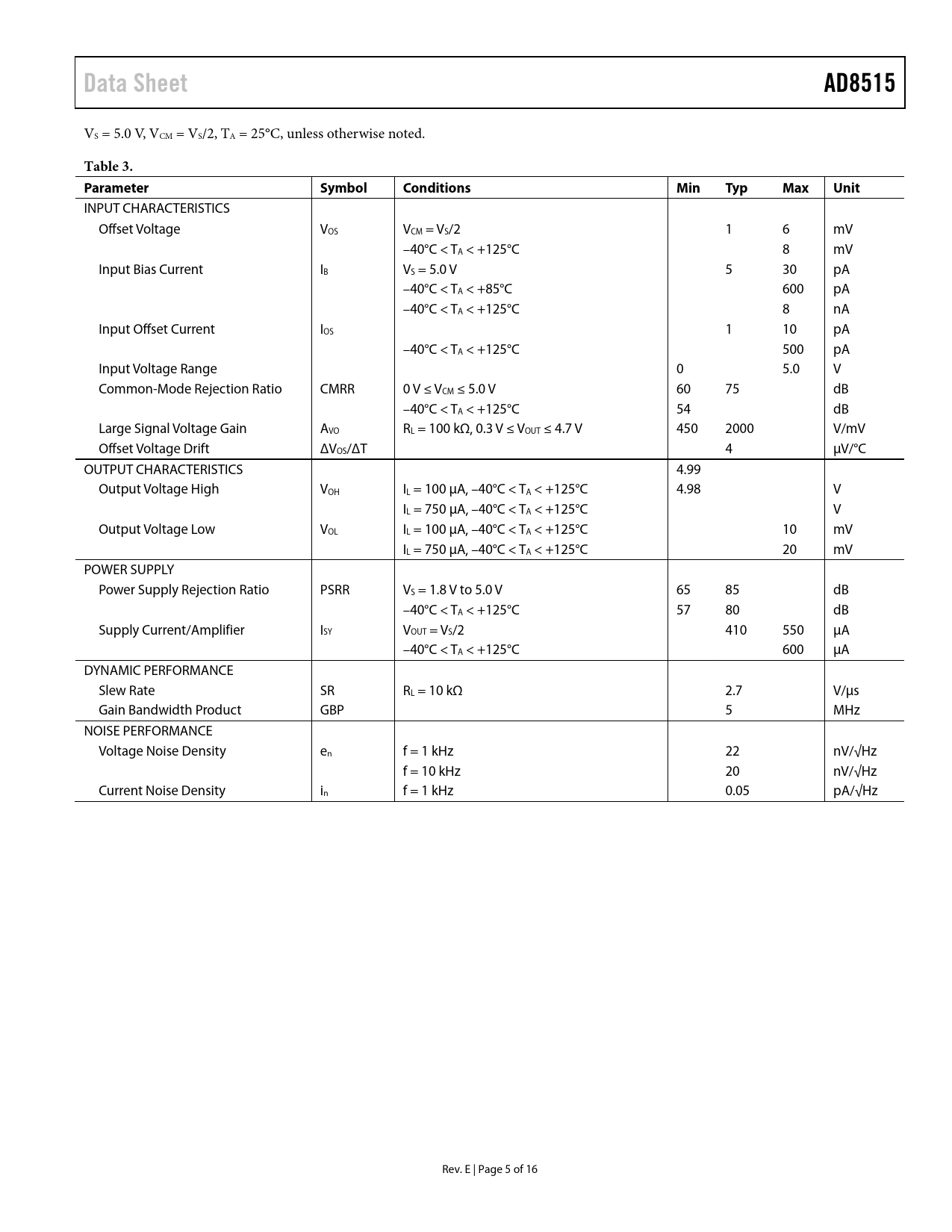Data Sheet. AD8515. Table 3. Parameter. Symbol. Conditions. Min. Typ. Max. Unit