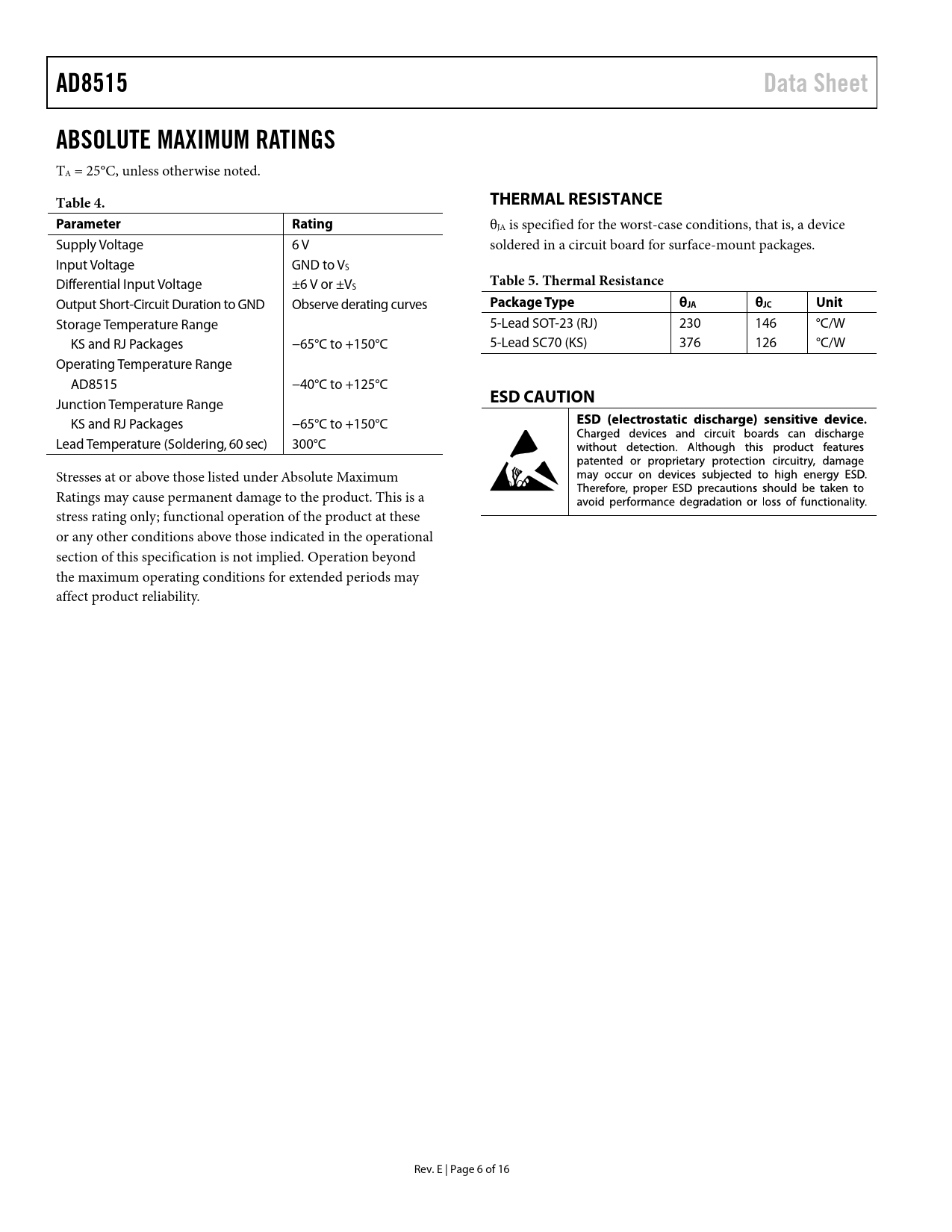 AD8515 Data Sheet ABSOLUTE MAXIMUM RATINGS Table 4 THERMAL RESISTANCE Parameter Rating Table 5 Thermal Resistance Package Type