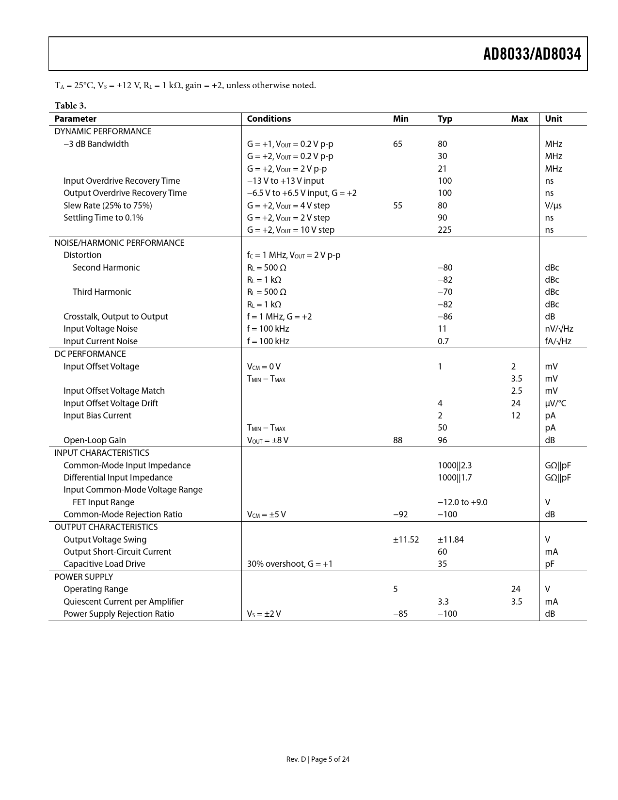 Seiten / Seite24 / 5 — AD8033/AD8034. Table 3. Parameter. Conditions. Min. Typ. Max. Unit
