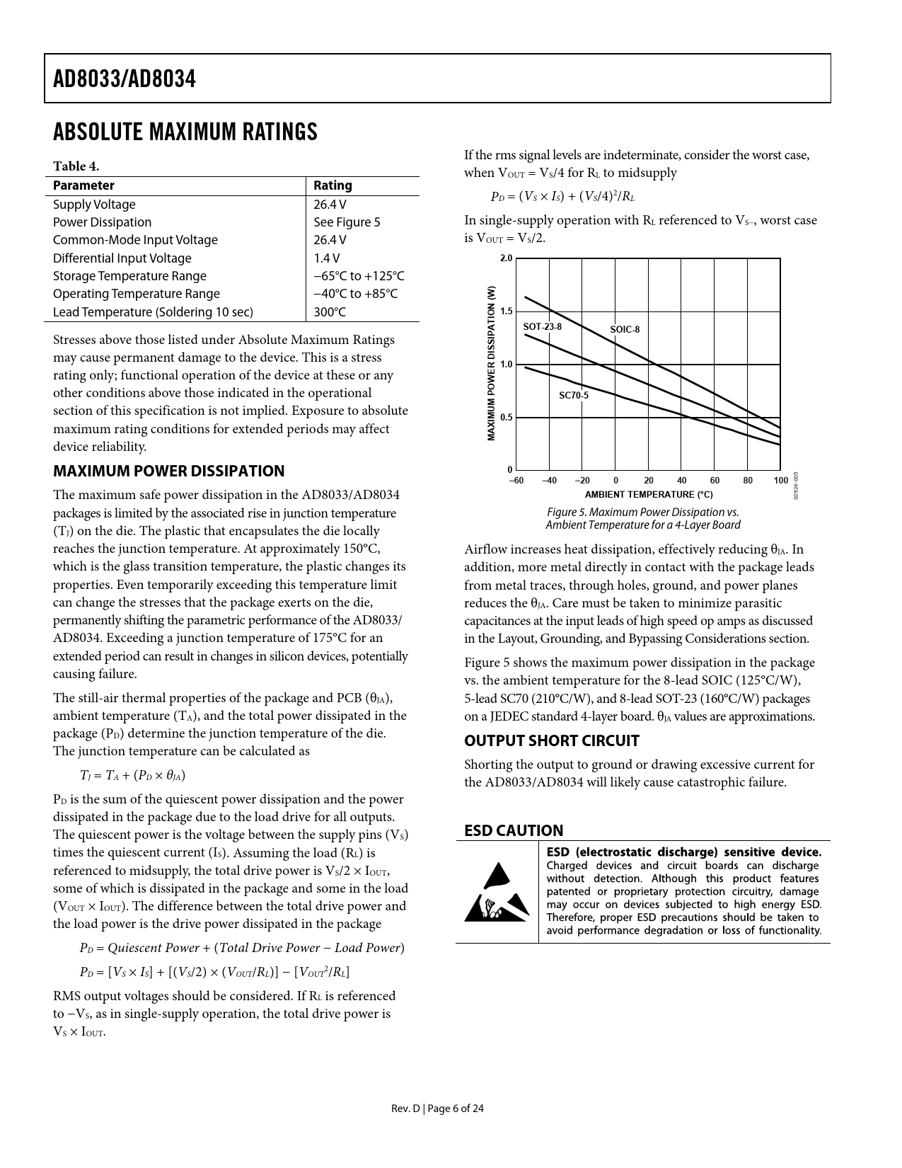 AD8033/AD8034. ABSOLUTE MAXIMUM RATINGS. Table 4. Parameter Rating. 2.0. W N (. 1.5. IO AT. SOT-23-8. SOIC-8. S S. R DI 1.0. W O. SC70-5. IM 0.5
