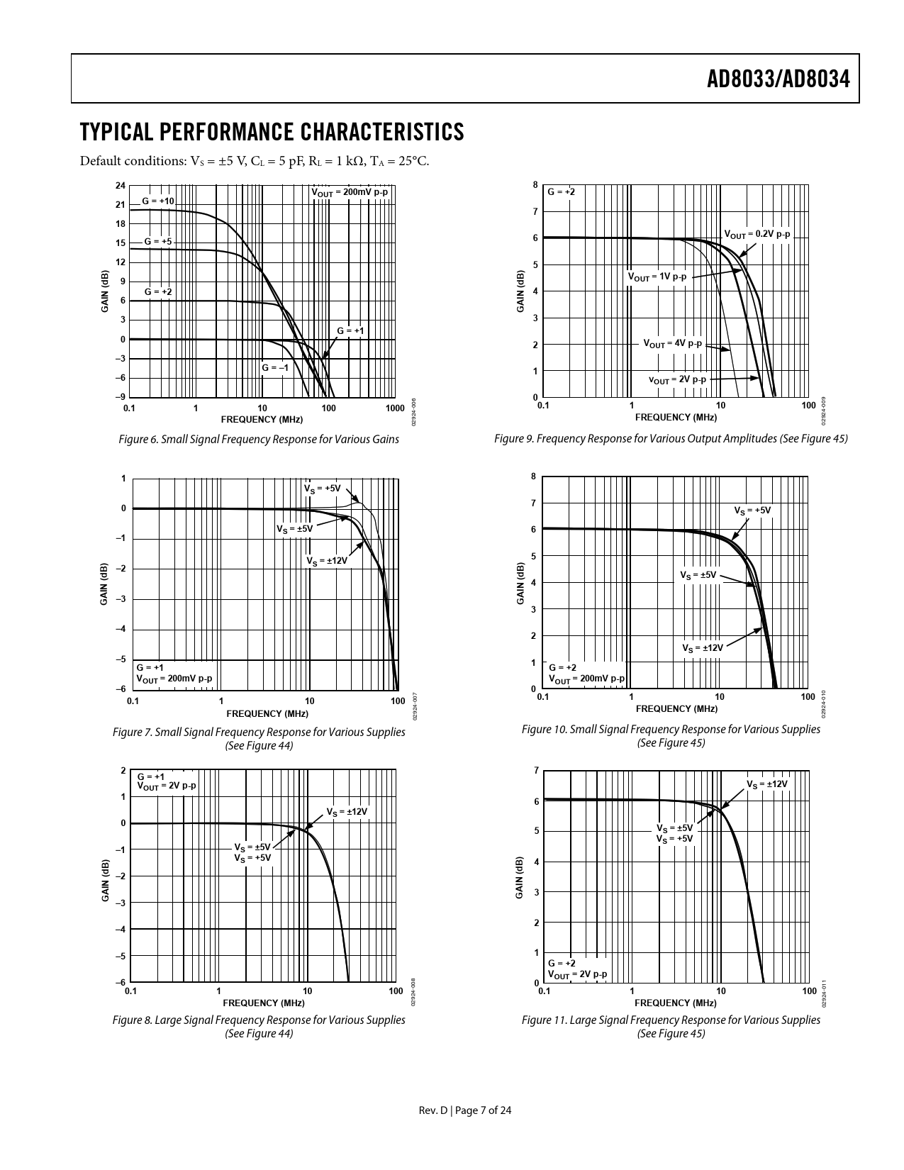 AD8033/AD8034. TYPICAL PERFORMANCE CHARACTERISTICS. VOUT = 200mV p-p. G = +2. G = +10. VOUT = 0.2V p-p. G = +5. OUT = 1V p-p. G = +1