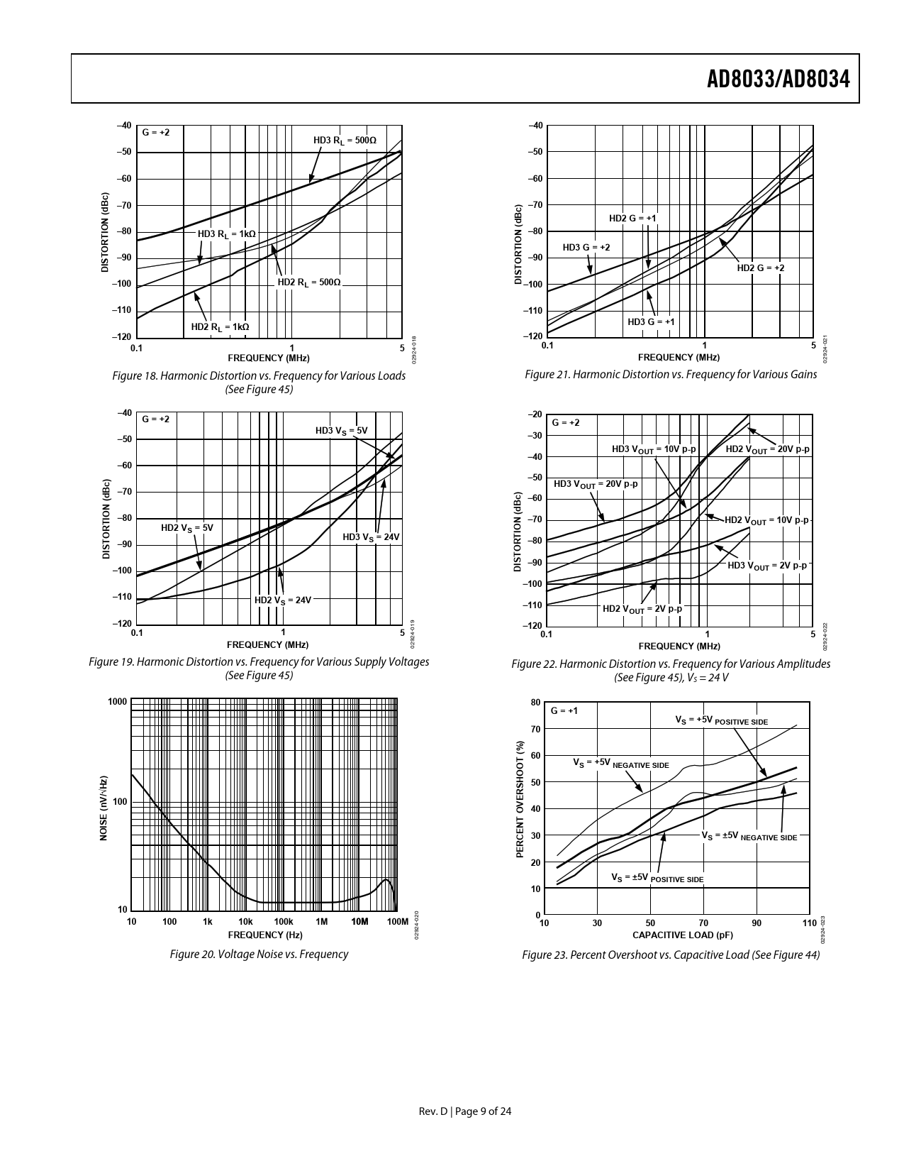 link to page 14 link to page 14 link to page 14 link to page 14 AD8033/AD8034–40–40G = +2HD3 RL = 500Ω–50–50–60–60c) B d –70–70(Bc) dHD2 G = +1ION –80(THD3 RN –80L = 1kΩIOORTHD3 G = +2T –90R –90ISODT SHD2 G = +2–100HD2 RL = 500ΩDI –100–110–110HD2 RHD3 G = +1L = 1kΩ–120–120 18 21 0 0.115 0 0.115 4- 4- FREQUENCY (MHz) 92 FREQUENCY (MHz) 92 02 02 Figure 18. Harmonic Distortion vs. Frequency for Various Loads Figure 21. Harmonic Distortion vs. Frequency for Various Gains (See Figure 45) –40–20G = +2G = +2HD3 VS = 5V–50–30HD3 VHD2 VOUT = 10V p-pOUT = 20V p-p–40–60–50HD3 VBc)OUT = 20V p-pd –70(c) –60NB dIO(T –80–70HD2 VOUT = 10V p-pRHD2 VS = 5VIONOTTHD3 VS = 24V–80S –90ORDIT IS –90HD3 V–100DOUT = 2V p-p–100–110HD2 VS = 24V–110HD2 VOUT = 2V p-p–120 19 –120 22 0.115 04- 0.115 0 4- FREQUENCY (MHz) 92 92 02 FREQUENCY (MHz) 02 Figure 19. Harmonic Distortion vs. Frequency for Various Supply Voltages Figure 22. Harmonic Distortion vs. Frequency for Various Amplitudes (See Figure 45) (See Figure 45), VS = 24 V 100080G = +1VS = +5V POSITIVE SIDE70) % ( T 60OVS = +5V NEGATIVE SIDE)O SH 50/√Hz V n 100VER(40EO TISENNOC 30VS = ±5V NEGATIVE SIDER PE 20VS = ±5V POSITIVE SIDE1010 20 0101001k10k100k1M01 M10M100M 0 3 4- 1030507090110 -02 FREQUENCY (Hz) 92 CAPACITIVE LOAD (pF) 24 02 29 0 Figure 20. Voltage Noise vs. Frequency Figure 23. Percent Overshoot vs. Capacitive Load (See Figure 44) Rev. D | Page 9 of 24 Document Outline FEATURES APPLICATIONS GENERAL DESCRIPTION TABLE OF CONTENTS REVISION HISTORY SPECIFICATIONS ABSOLUTE MAXIMUM RATINGS MAXIMUM POWER DISSIPATION OUTPUT SHORT CIRCUIT ESD CAUTION TYPICAL PERFORMANCE CHARACTERISTICS TEST CIRCUITS THEORY OF OPERATION OUTPUT STAGE DRIVE AND CAPACITIVE LOAD DRIVE INPUT OVERDRIVE INPUT IMPEDANCE THERMAL CONSIDERATIONS LAYOUT, GROUNDING, AND BYPASSING CONSIDERATIONS BYPASSING GROUNDING LEAKAGE CURRENTS INPUT CAPACITANCE APPLICATIONS INFORMATION HIGH SPEED PEAK DETECTOR ACTIVE FILTERS WIDEBAND PHOTODIODE PREAMP OUTLINE DIMENSIONS ORDERING GUIDE